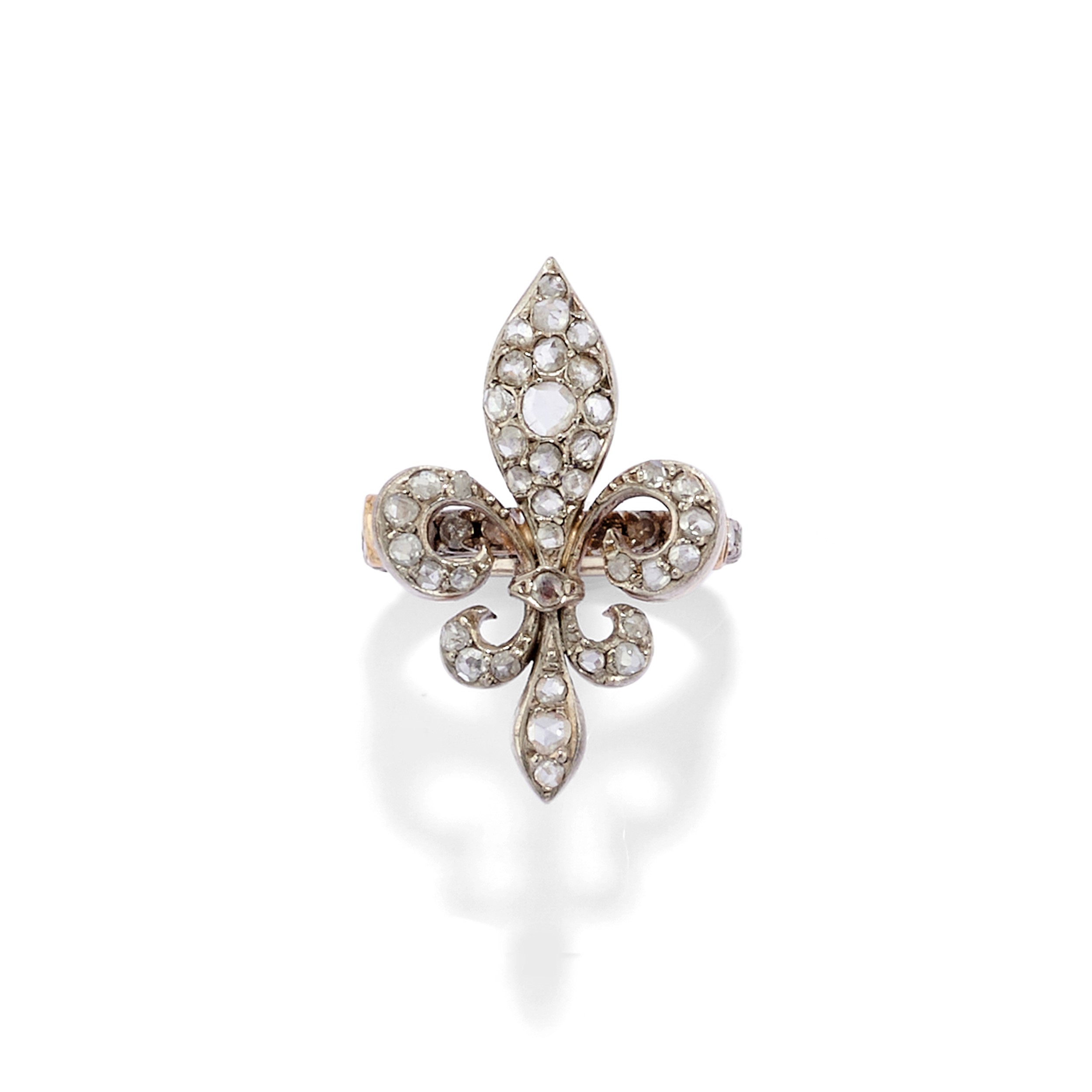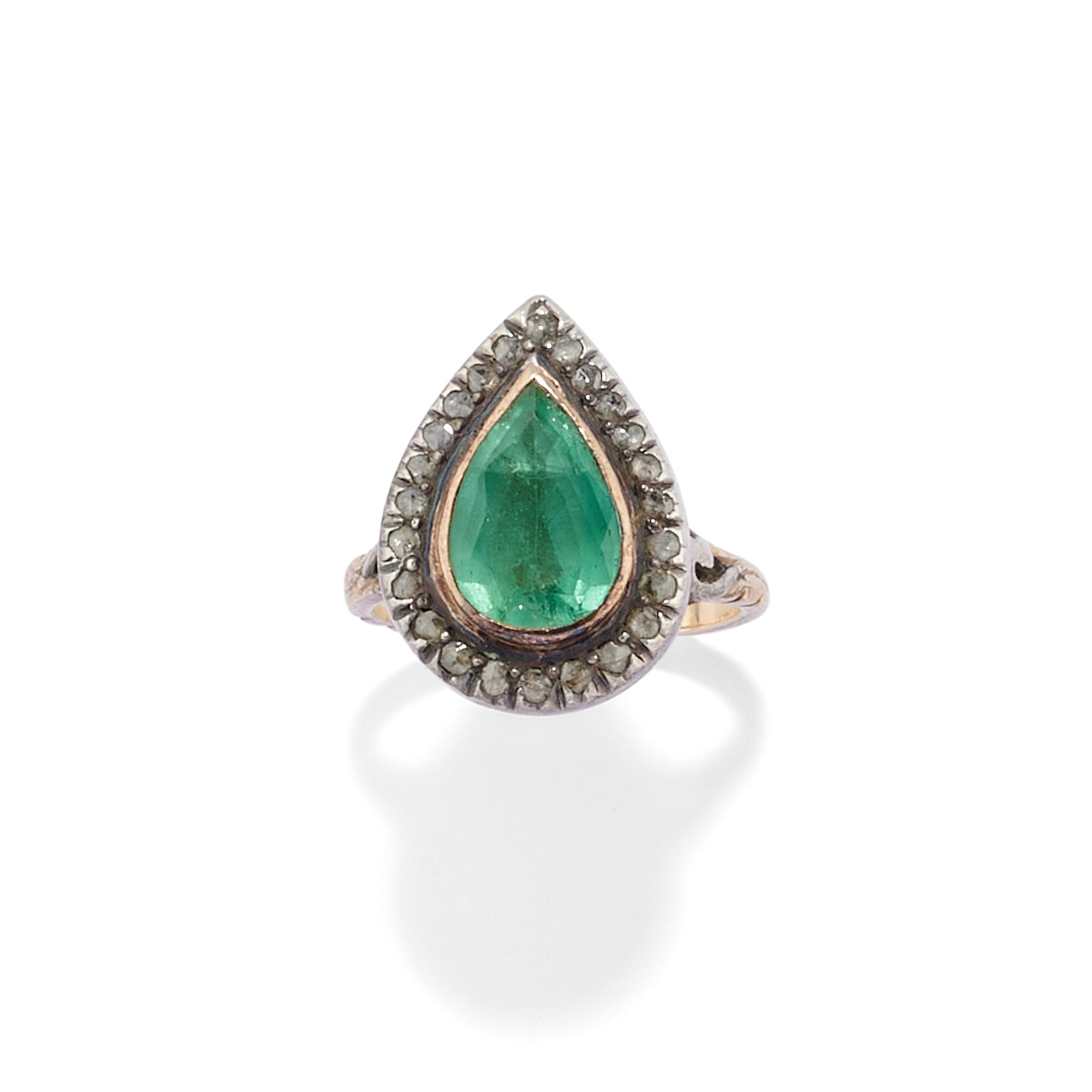 18k two-color gold and silverone of a Florentine lily design with rose-cut diamonds, the other with a pear-cut emerald surrounded by rose-cut diamonds.