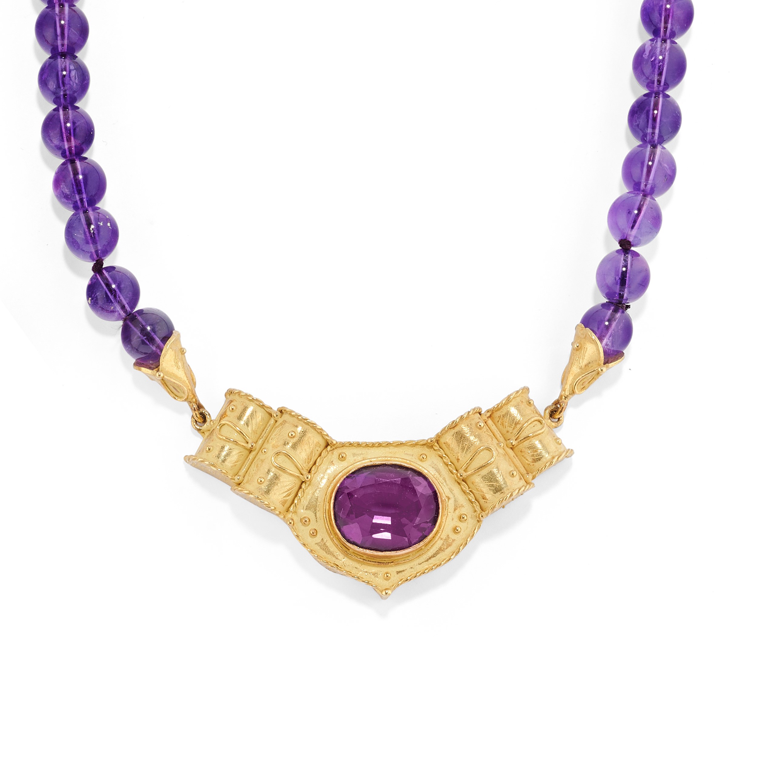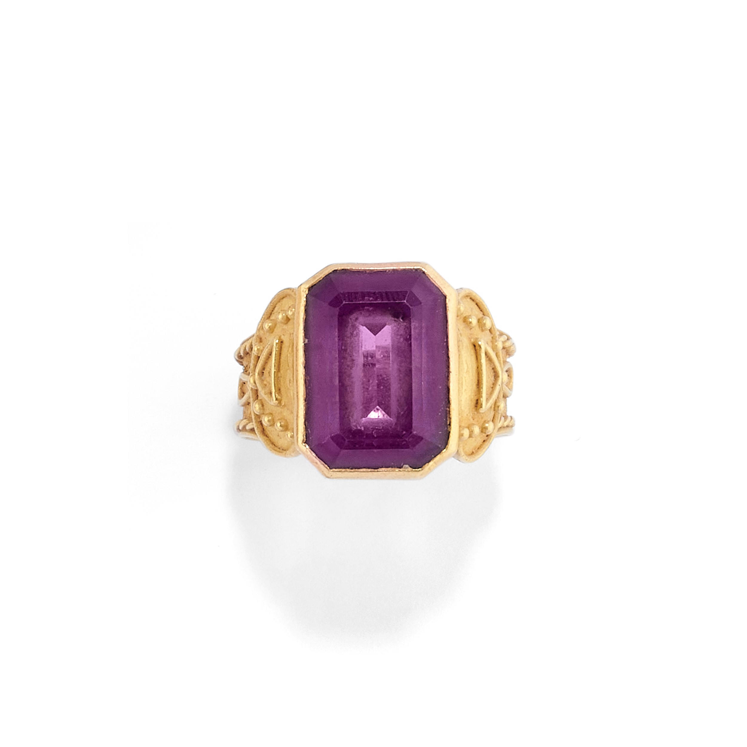 18k yellow goldcomprising a necklace set with a single strand of amethyst boules measuring approx. 8.00 mm with a central amethyst with relief workmanship and a ring with emerald-cut amethyst.