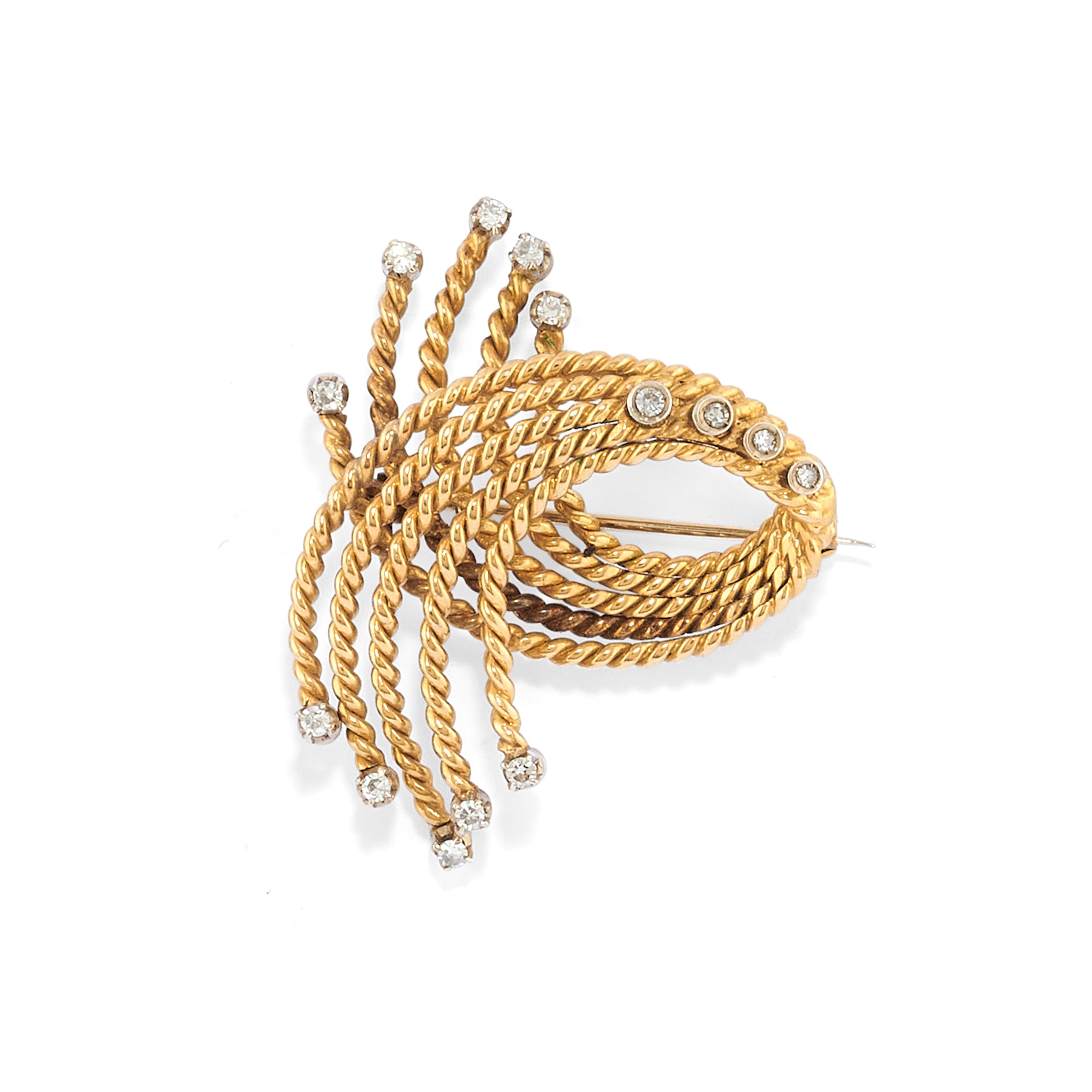 scroll brooch with twisted threads set with huit-huit cut diamonds; flower ring with a brilliant cut diamond of approx. 0.40 ct surrounded by round-cut rubies, defects (fractures on the lower part of the shank).