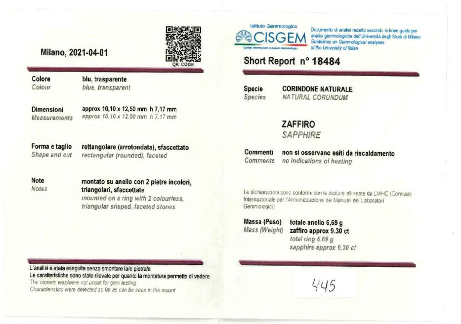 Lo zaffiro che non presenta esiti da riscaldamento è accompagnato da Short Report n 18484 del 01/04/2021, Cisgem, Milano.