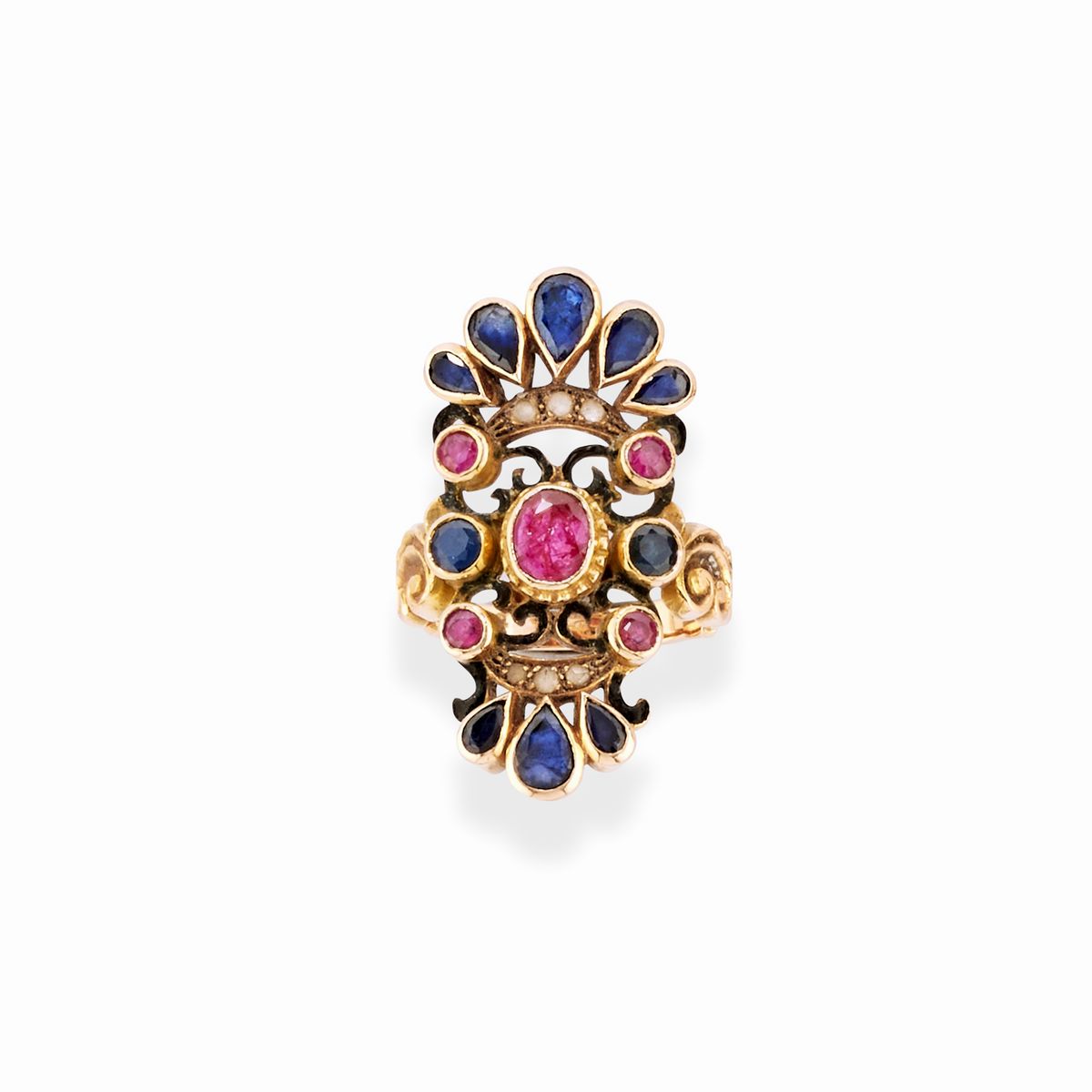 A 18k and low carat yellow gold, silver, emerald, ruby, sapphire, diamond and enamel two earrings and two rings