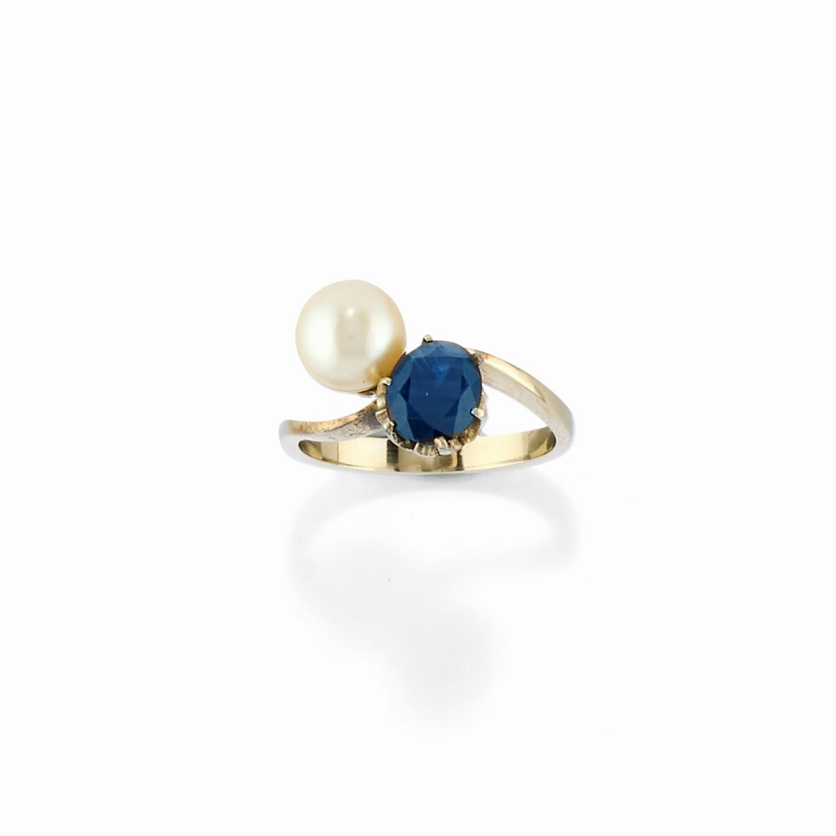 Ring with cultured pearl approx. mm 7,00 and oval cut sapphire