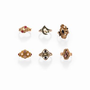 A 18k yellow gold, turquoise, coral and micropearl lot of six jewels