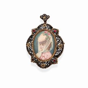 A 18k two-color gold, emerald, diamond and sapphire pendant