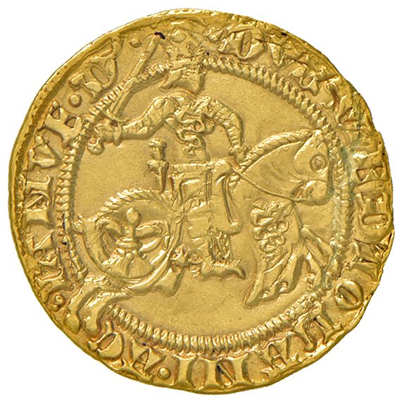 Ducato, con busto del duca a d., e il duca a cavallo a d. Crippa 4 MIR 171. ORO, gr. 3,50. Raro. Proveniente da incastonatura. MB/qSPLStarting bid