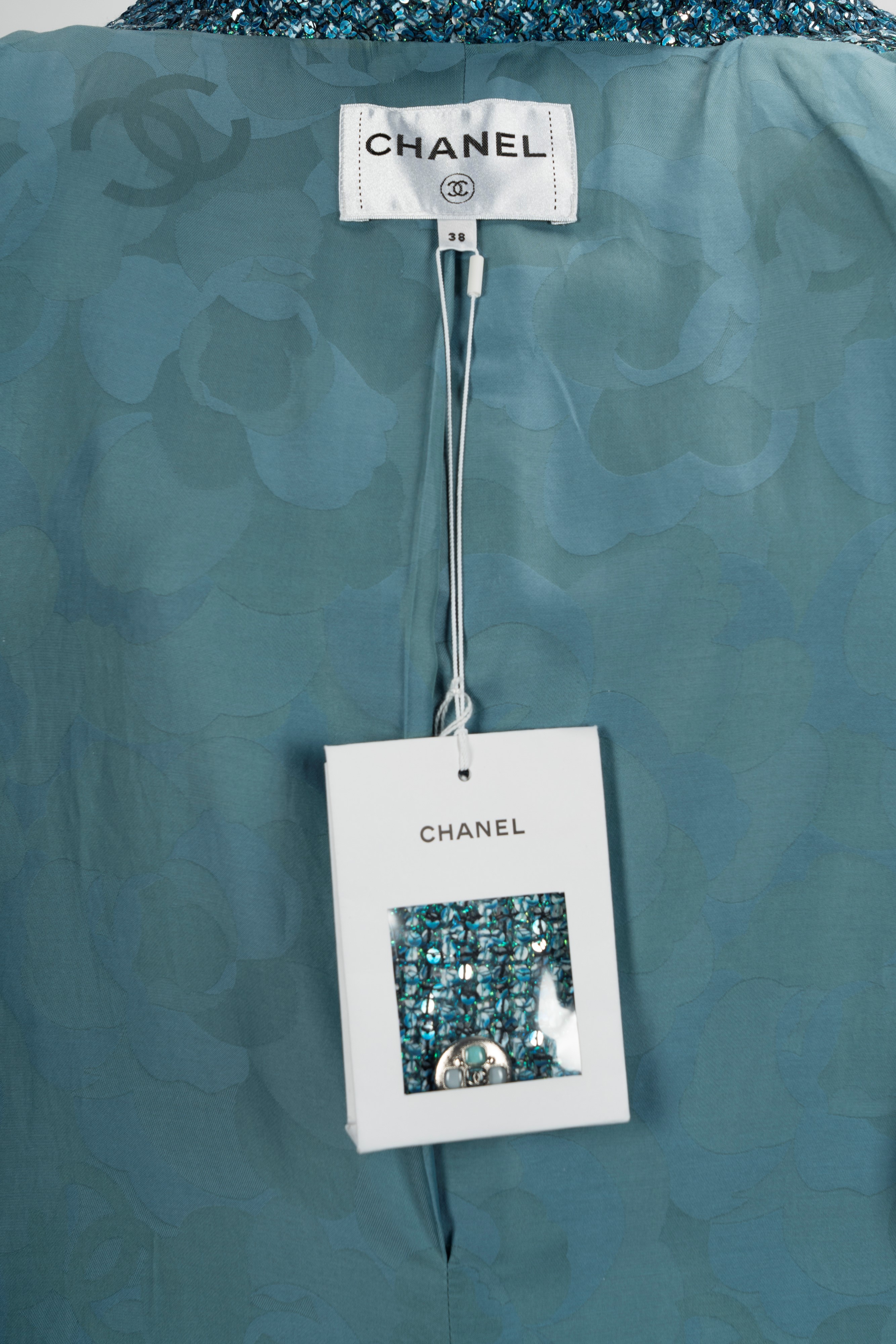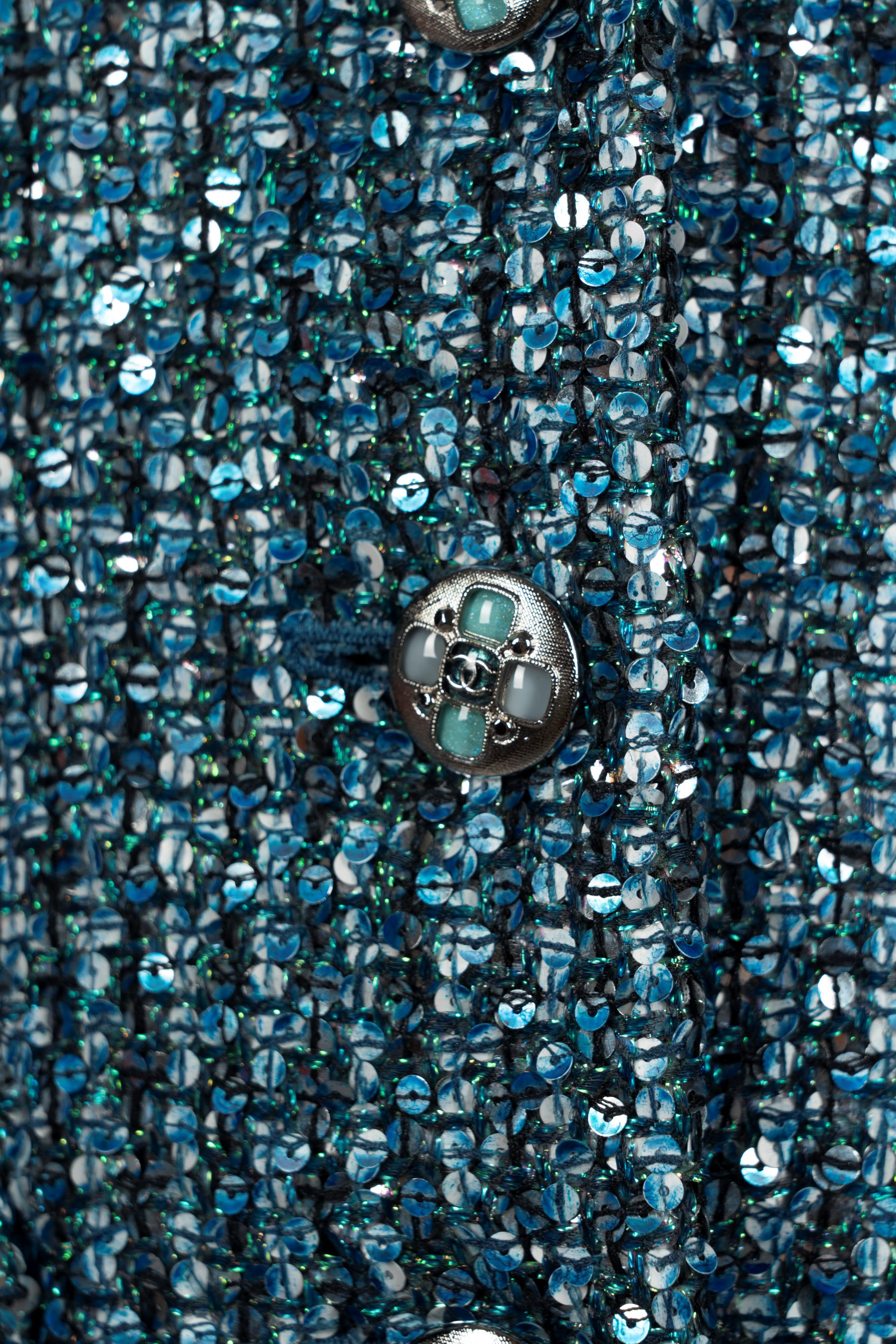Blue, turquoise, white, and green sequins embroidered long sleeved coat, jewel buttons with logo, silk and cotton lining, size 38, with dustbagStarting bid