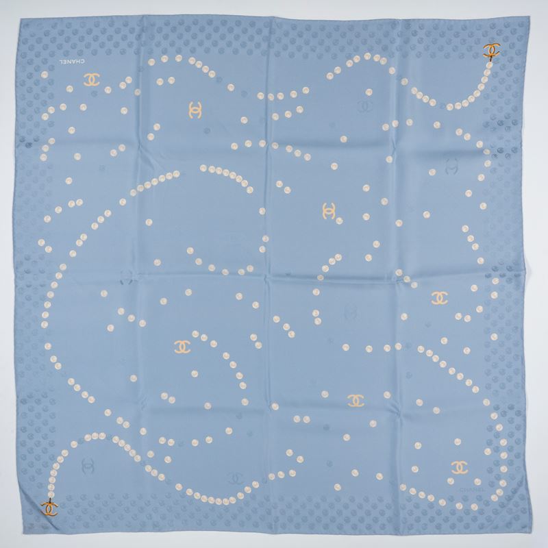 Light blu silk twill scarf with double color pearls print, with box