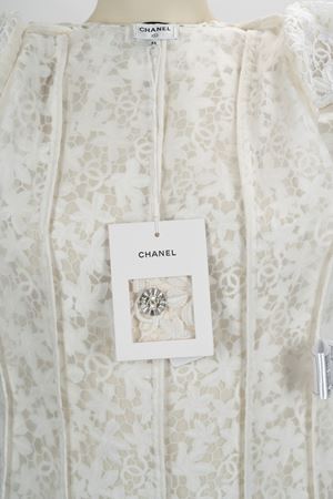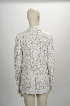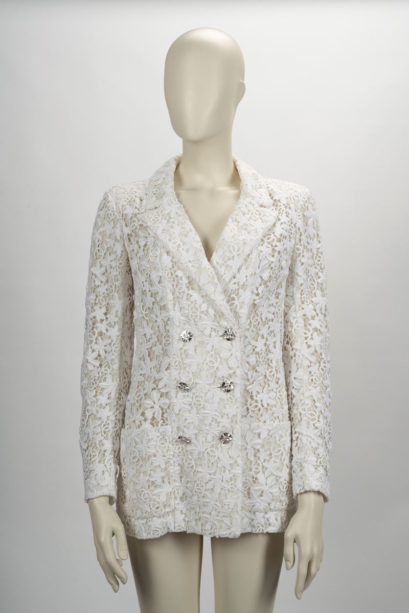 White lace long sleeved long jacket, jewel buttons with logo, silk organdy lining, size 36, with dustbagStarting bid