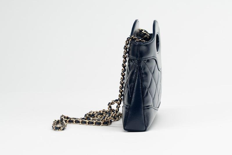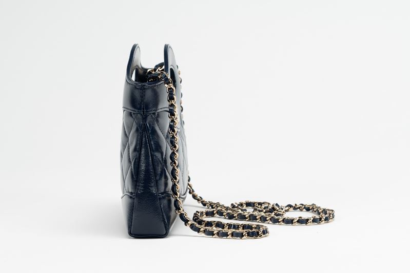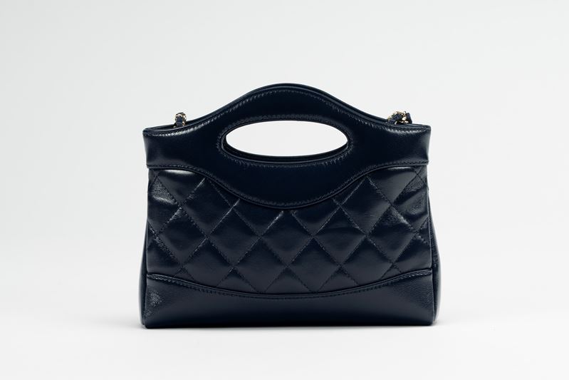 Blue navy matelassé leather mini bag with chain shoulder strap, metal details, cm 20, with dustbagStarting bid