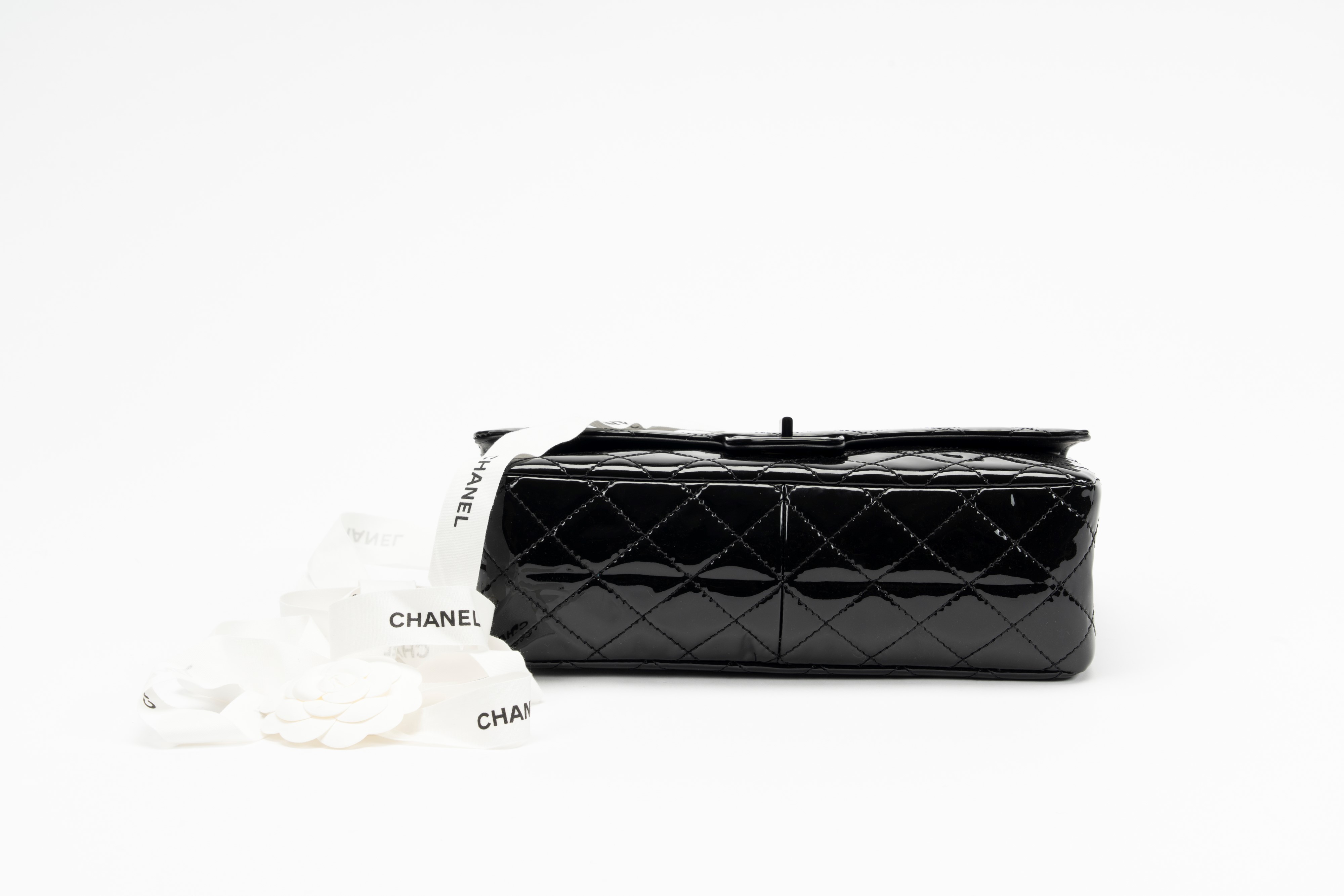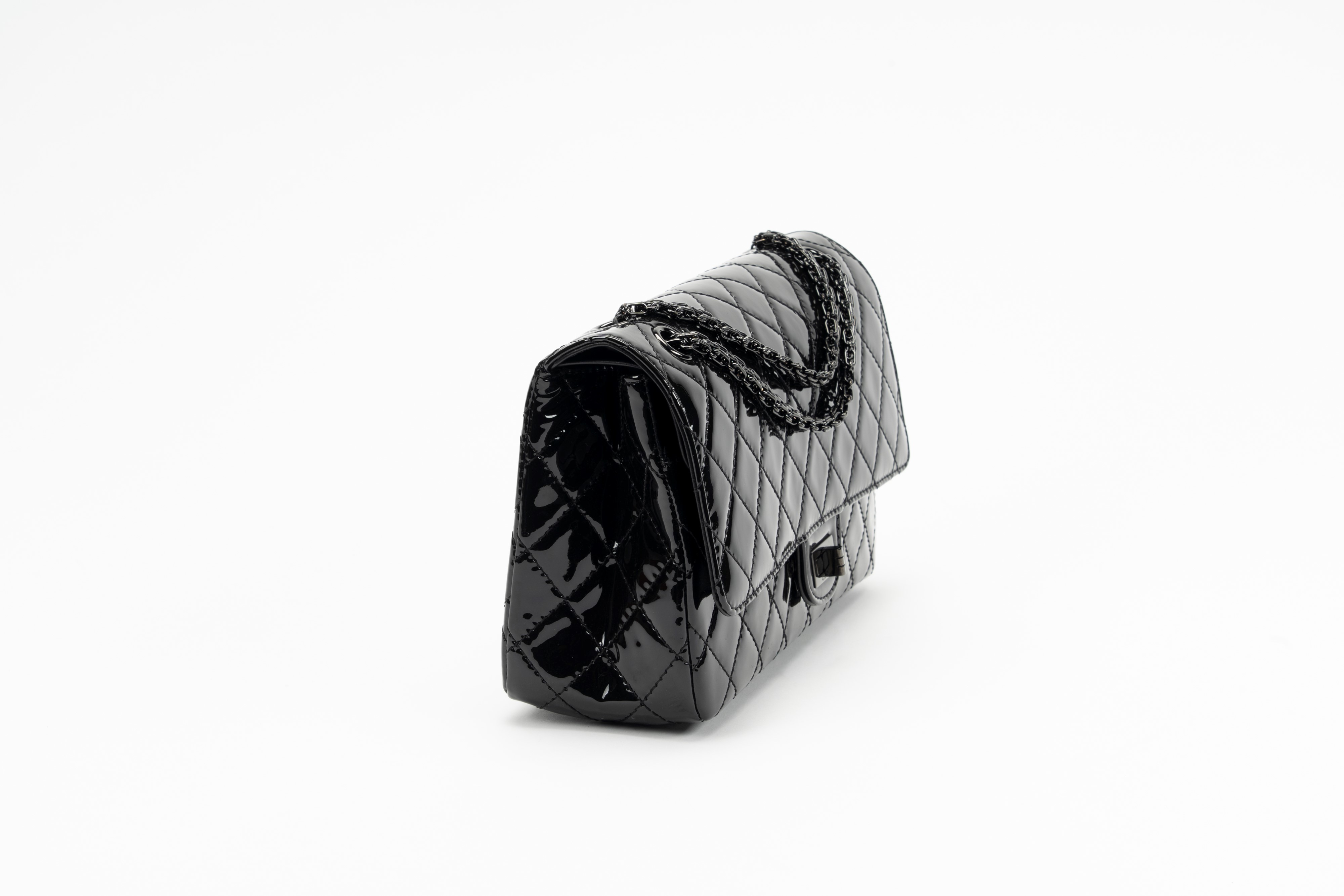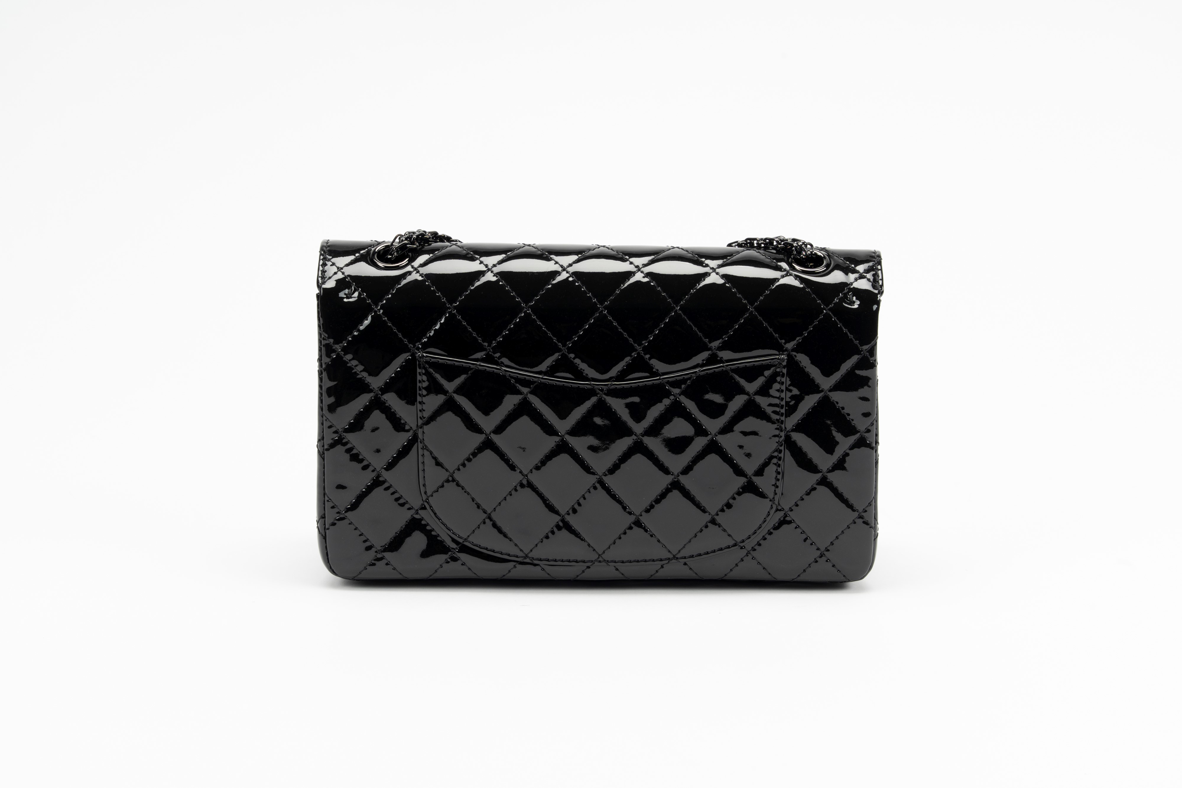 Black matelassé patent leather, chain shoulder strap, black leather lining, cm 28, with dustbag and box