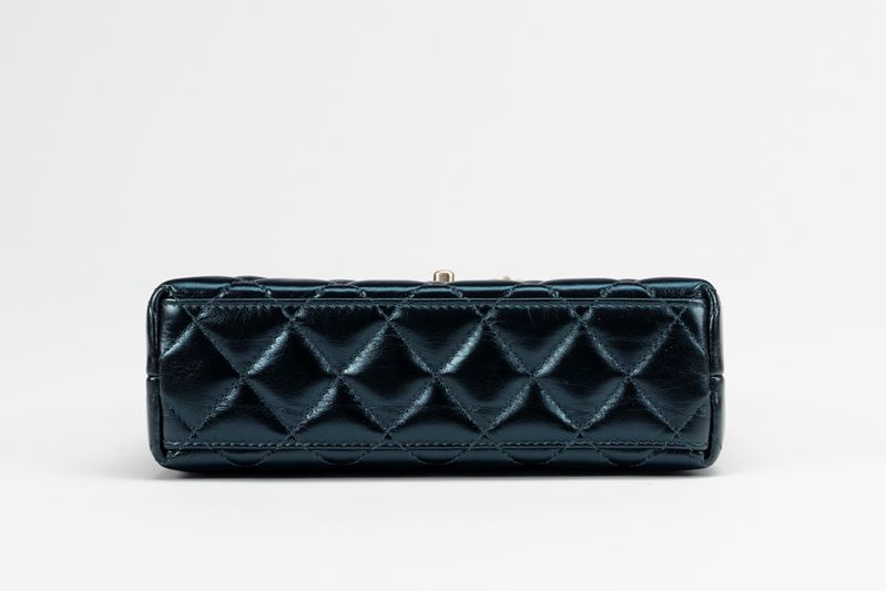Navy blue matelassé leather bag, chain shoulder strap, burnished metal gilt details, cm 19, with dustbagStarting bid