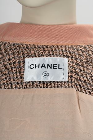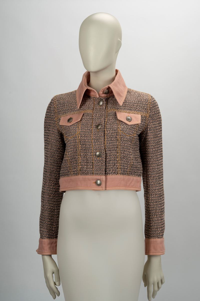 Pink, black, and cream tweed long sleeved short jacket, metal buttons with logo, silk lining, size 34Starting bid