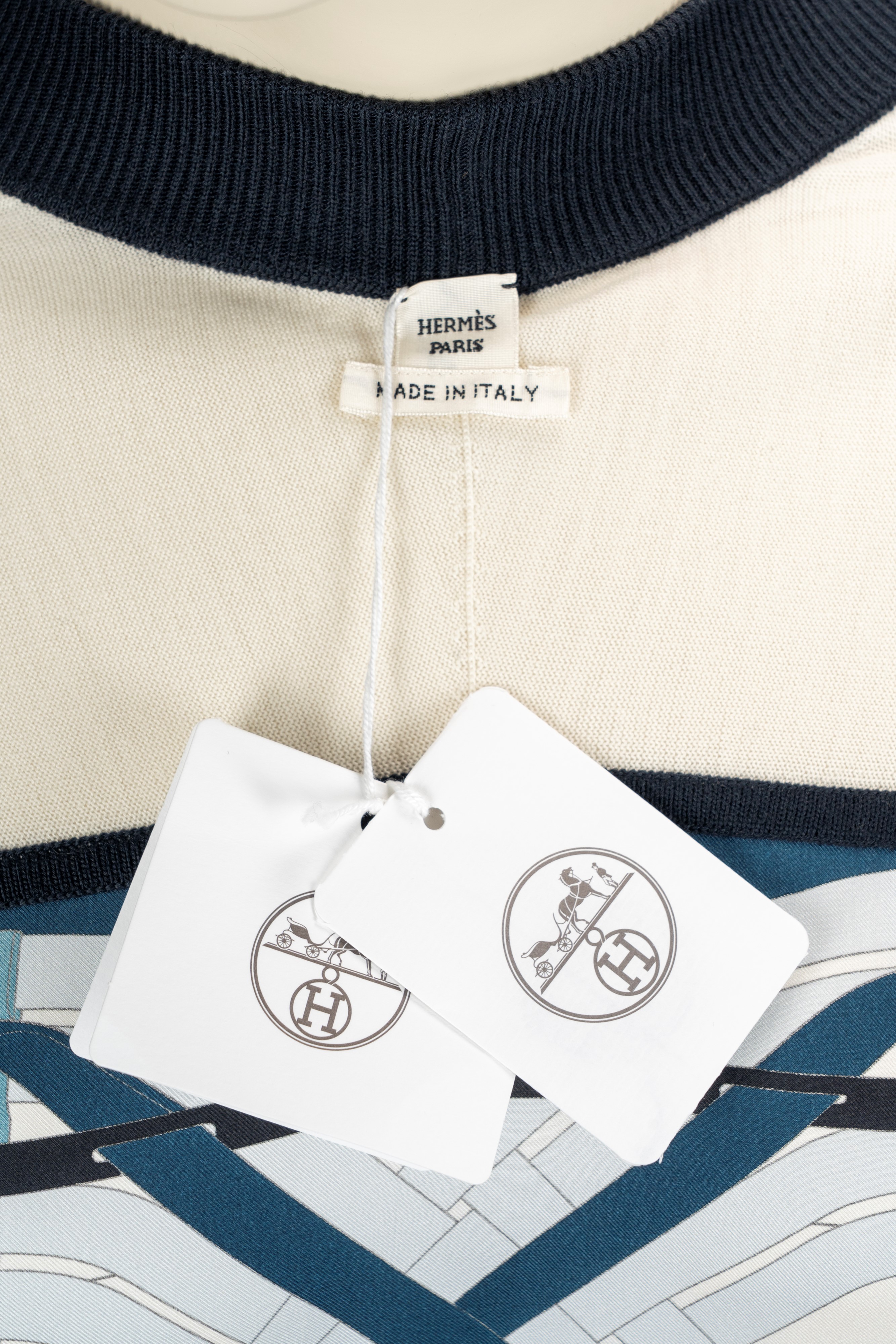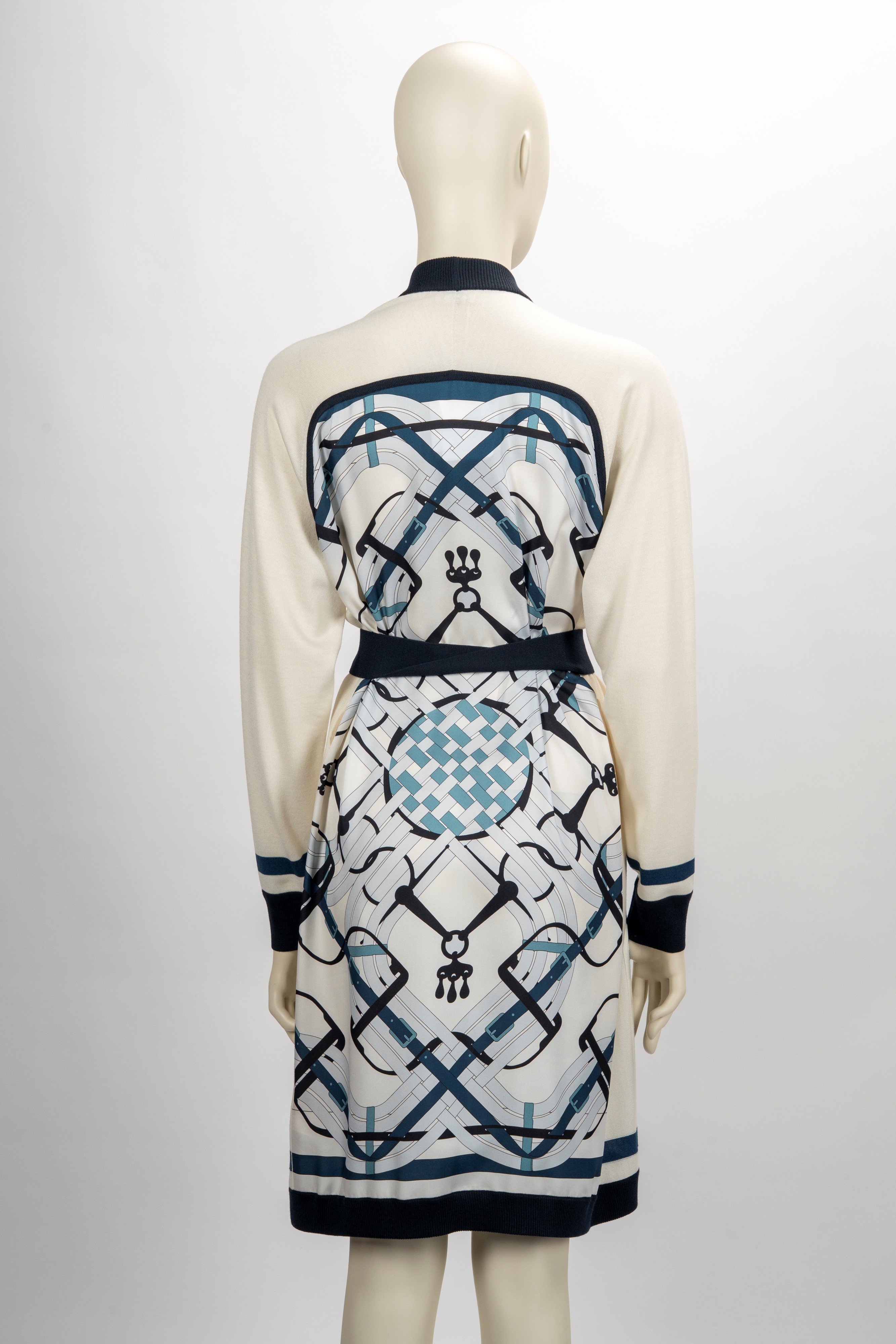 Cream, blue, and midnight blue printed mixed wool cardigan, with belt, size 34Starting bid