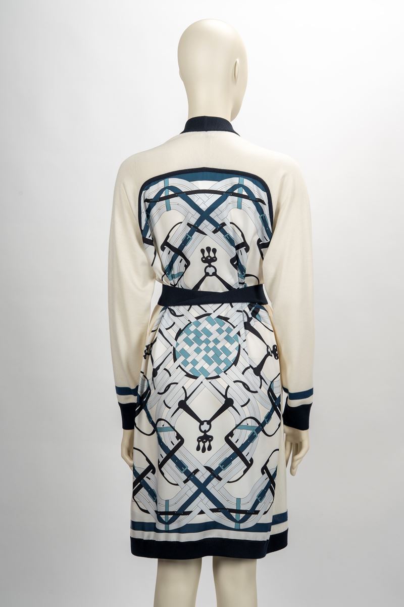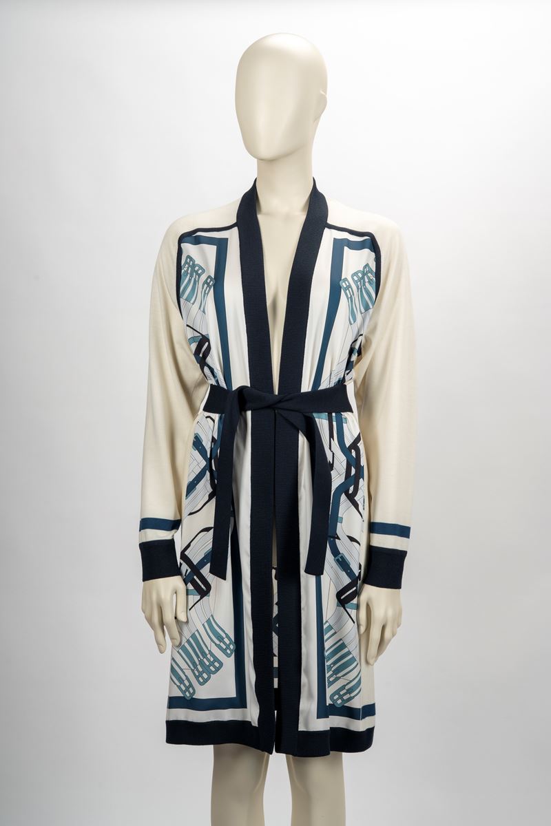 Cream, blue, and midnight blue printed mixed wool cardigan, with belt, size 34