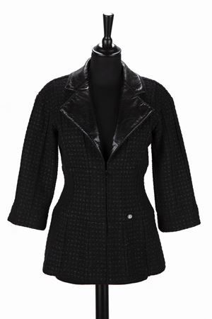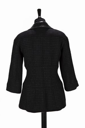Black bouclé wool jacket, 3/4 sleeves, zip closure, black leather details, silk lining, size 36.Estimate