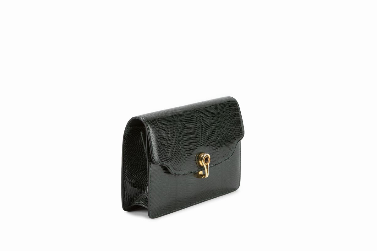 Dark green lizard leather clutch bag, with removable shoulder strap, cm 20, with dustbag.