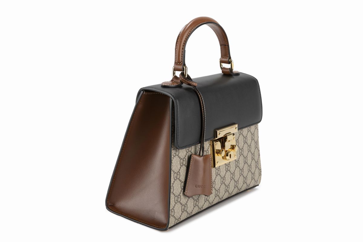 Padlock GG bicolor leather bag, with detachable shoulder strap, gilt tone clasp, cm 28, with dustbag and box, new never worn.Estimate