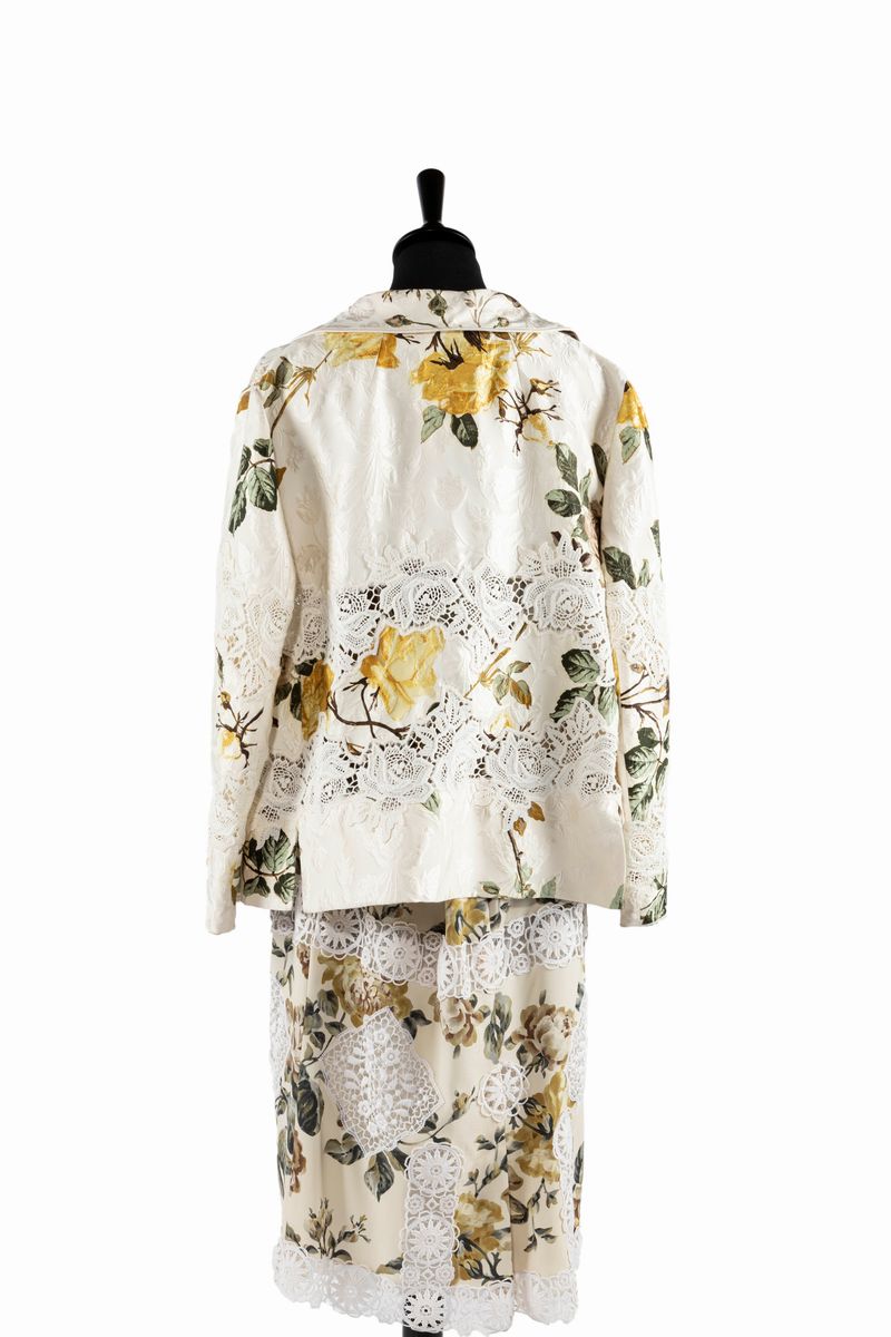 Flowers silk and cream lace inserts jacket with sleevesless top and skirt, size 46.Starting bid