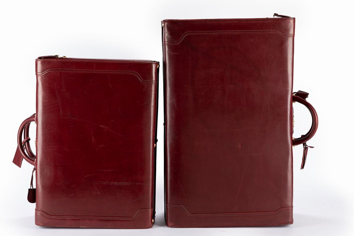 Lot of two burgundy leather suitcases, doubles handles, metal gilt details, measures cm 75 x 46 x 24 and cm 60 x 43 x 21 (defects).Starting bid