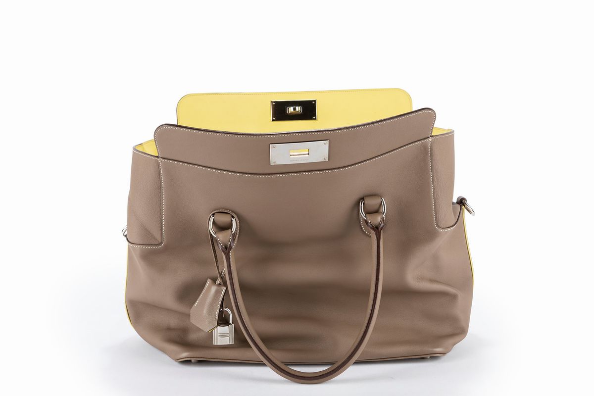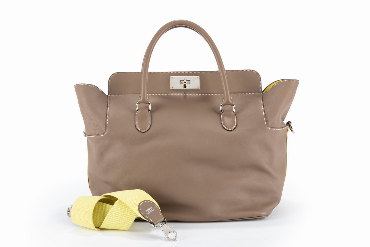 Etoupe Toolbox leather bag, detachable light yellow shoulder strap, palladium hardware, cm 33 (very slight defects).Starting bid
