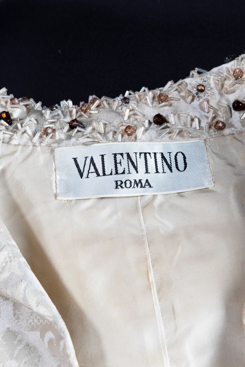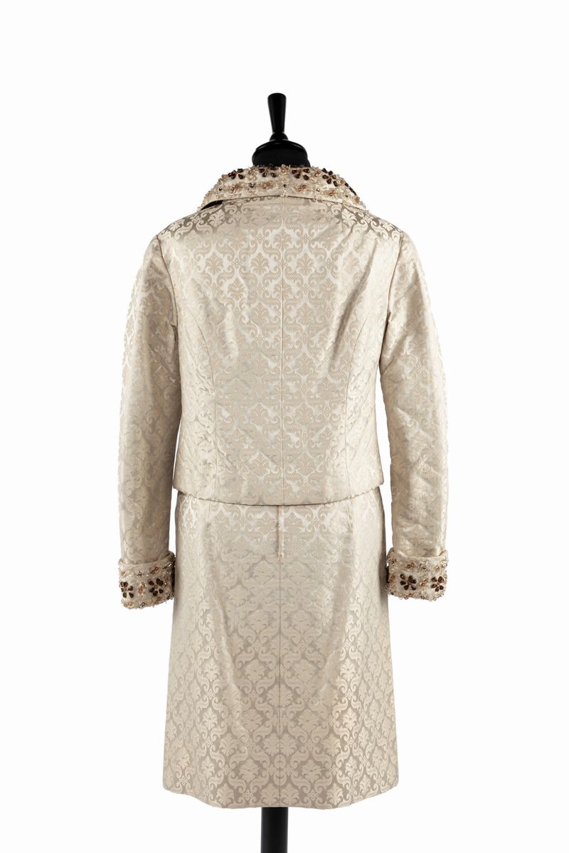 Evening suit jacket with skirt in satin silk, rhynestones embroidered details (defects and missings).Lot that belonged to the English model Fay Vitucci Phillips, who worked in the 50's and the 60's for the best Italian fashion houses of that period.