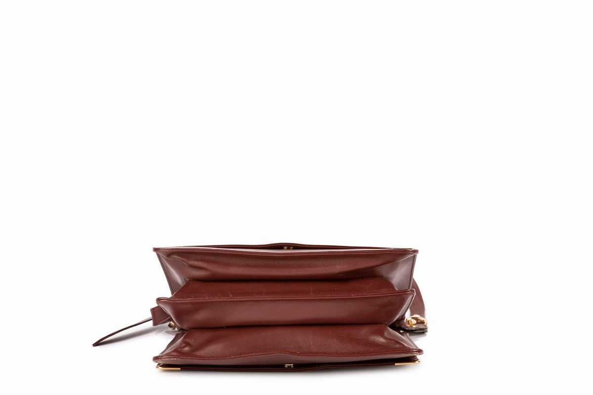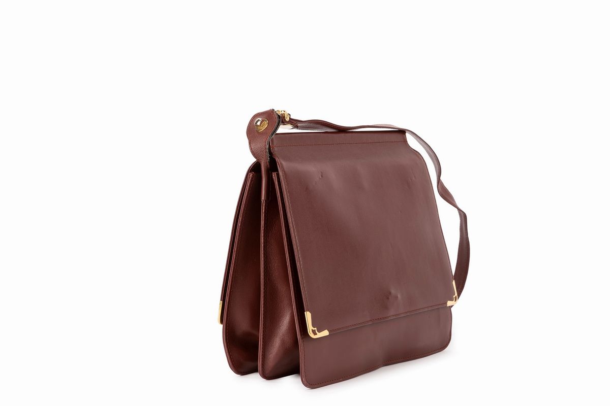 Burgundy leather bag, with shoulder strap, metal gilt details, cm 25 (defects).Starting bid