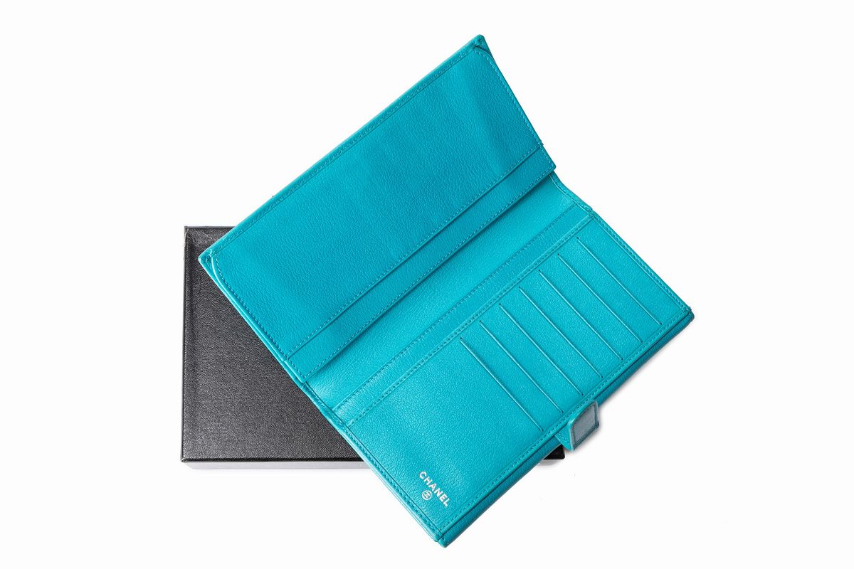 Teal blue leather camelia wallet, 19 x 11 cm, with box (slight defects).Starting bid