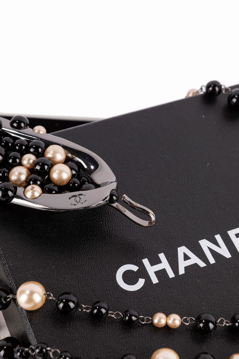 Fancy pearls and black boules belt, metal burnished details, cm 100, with box (slight defects).Starting bid
