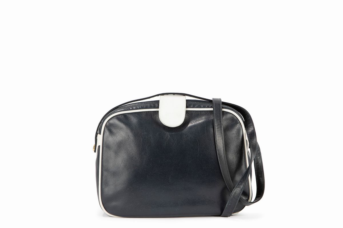 Dark blue and white leather shoulder strap bag, cm 24 (defects).Starting bid
