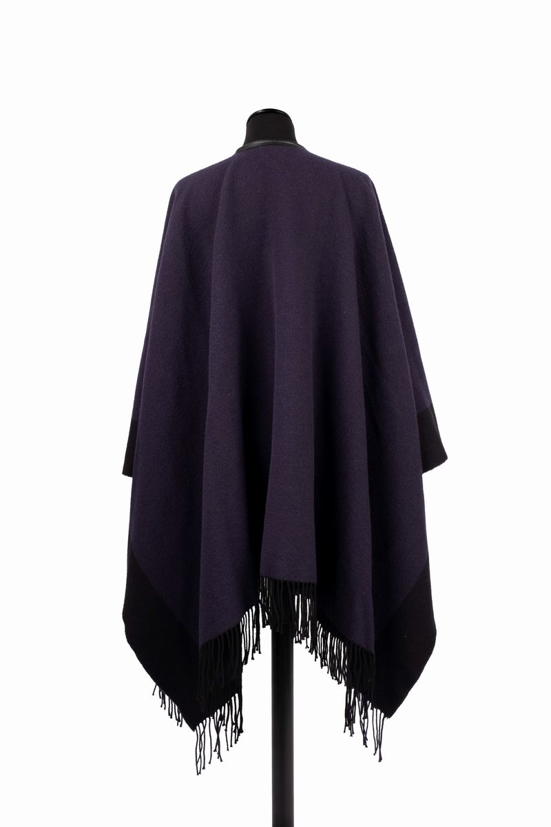 Blue and black wool and cachemire cape, leather inserts, one size (defects).Starting bid