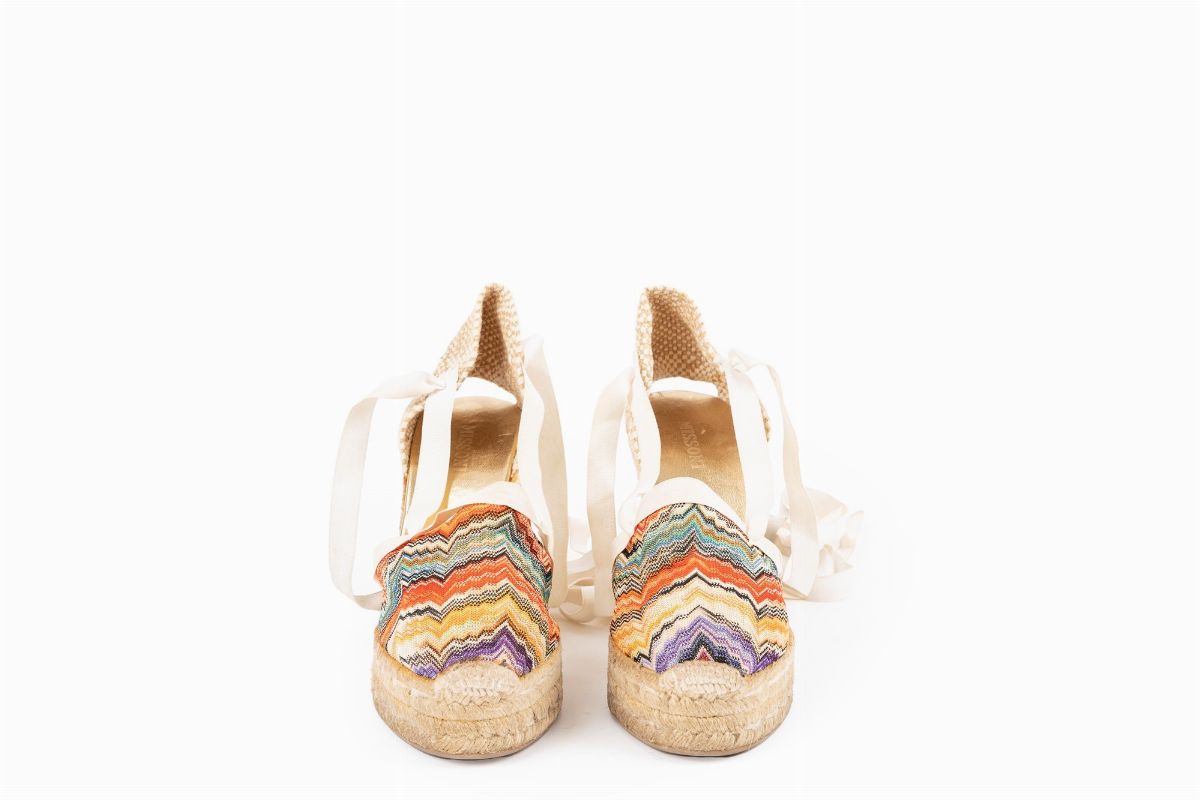 Espadrillas sandals, multicolor printed canvas, heel cm 11, size 38 (defects)