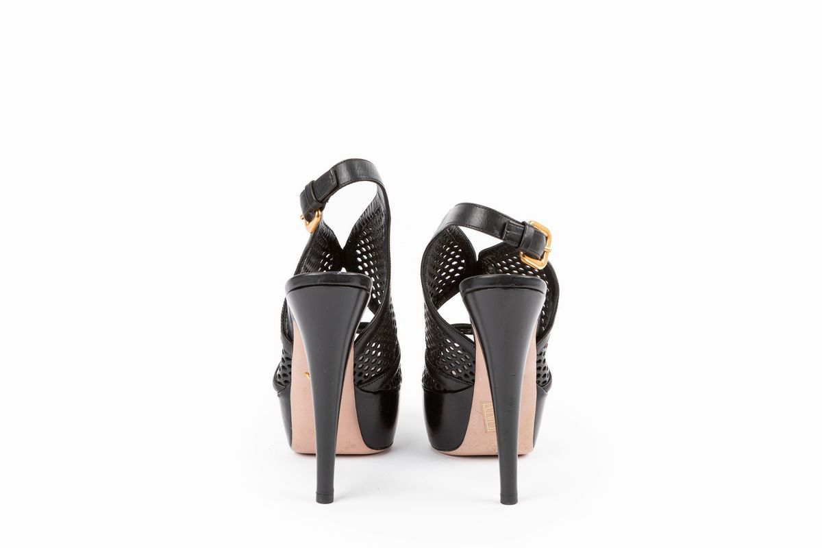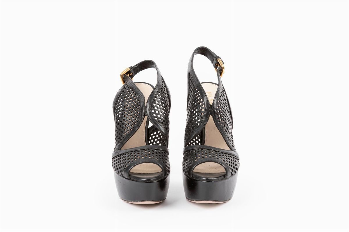 Black perforated leather sandals, plateau cm 15, size 38, with dustbag (new and never worn)