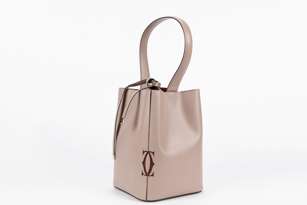 Etoupe leather bucket shoulder bag, burgundy lining canvas, metal details, base cm 20, with dustbagStarting bid