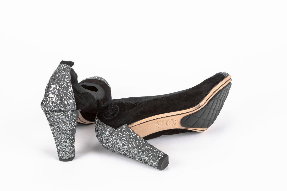 Black suede décolleté shoes, glittery heels and toe, size 39,5, heel cm 9 (new and never worn)