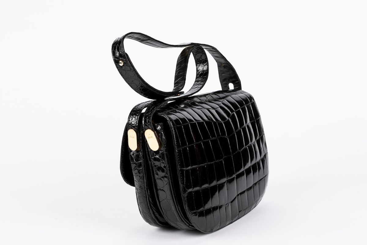 Black crocodile leather shoulder bag, metal gilt details, cm 26 (defects)