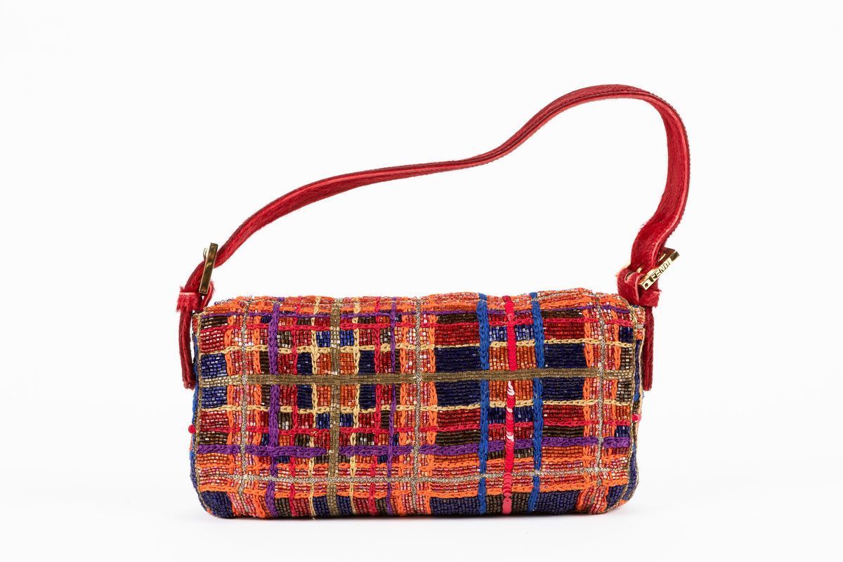 Tartan pattern fabric entirely embroidered with multicolor glass beads and sequins baguette bag, ruby tone pony hair closure and shoulder, metal gilt details, cm 27, with dustbagStarting bid