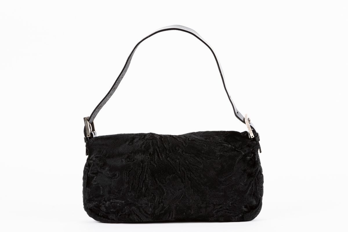 Black fur and leather baguette bag, metal details, cm 27, with dustbagStarting bid
