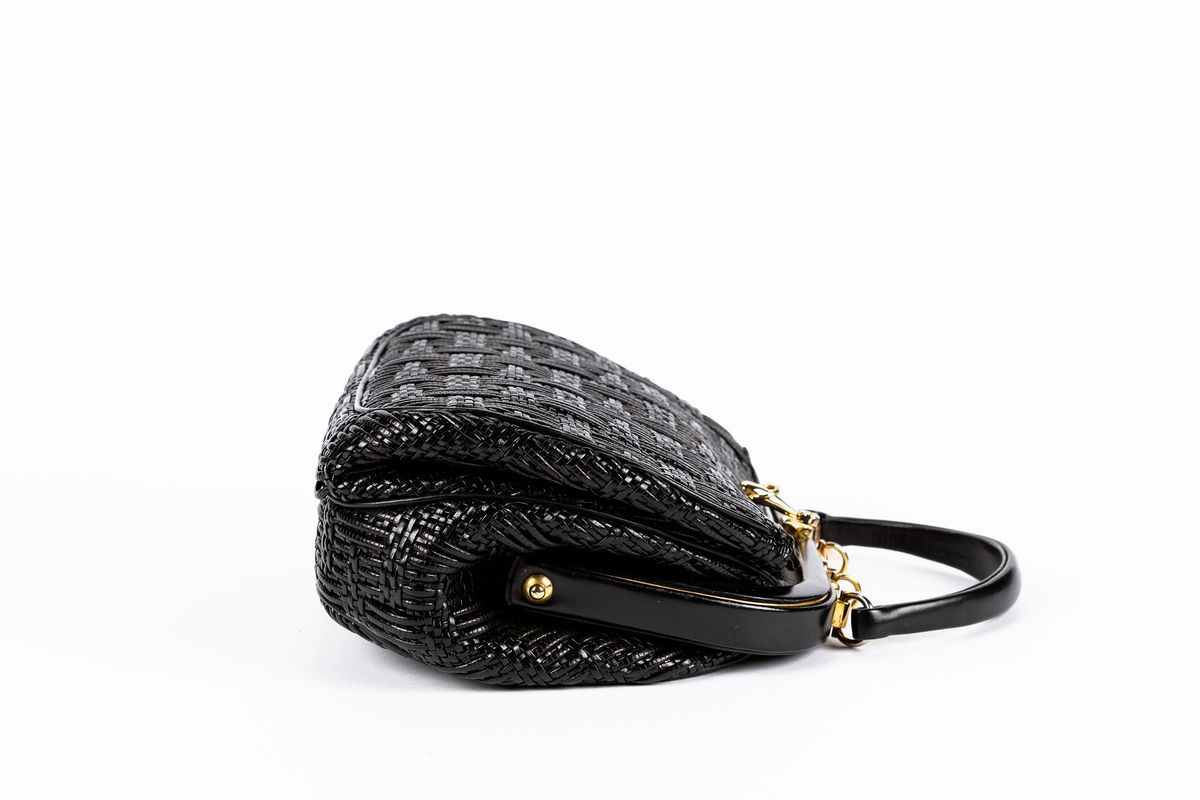 Black woven leather handbag, metal gilt details, front pocket, cm 23 (defects)Starting bid