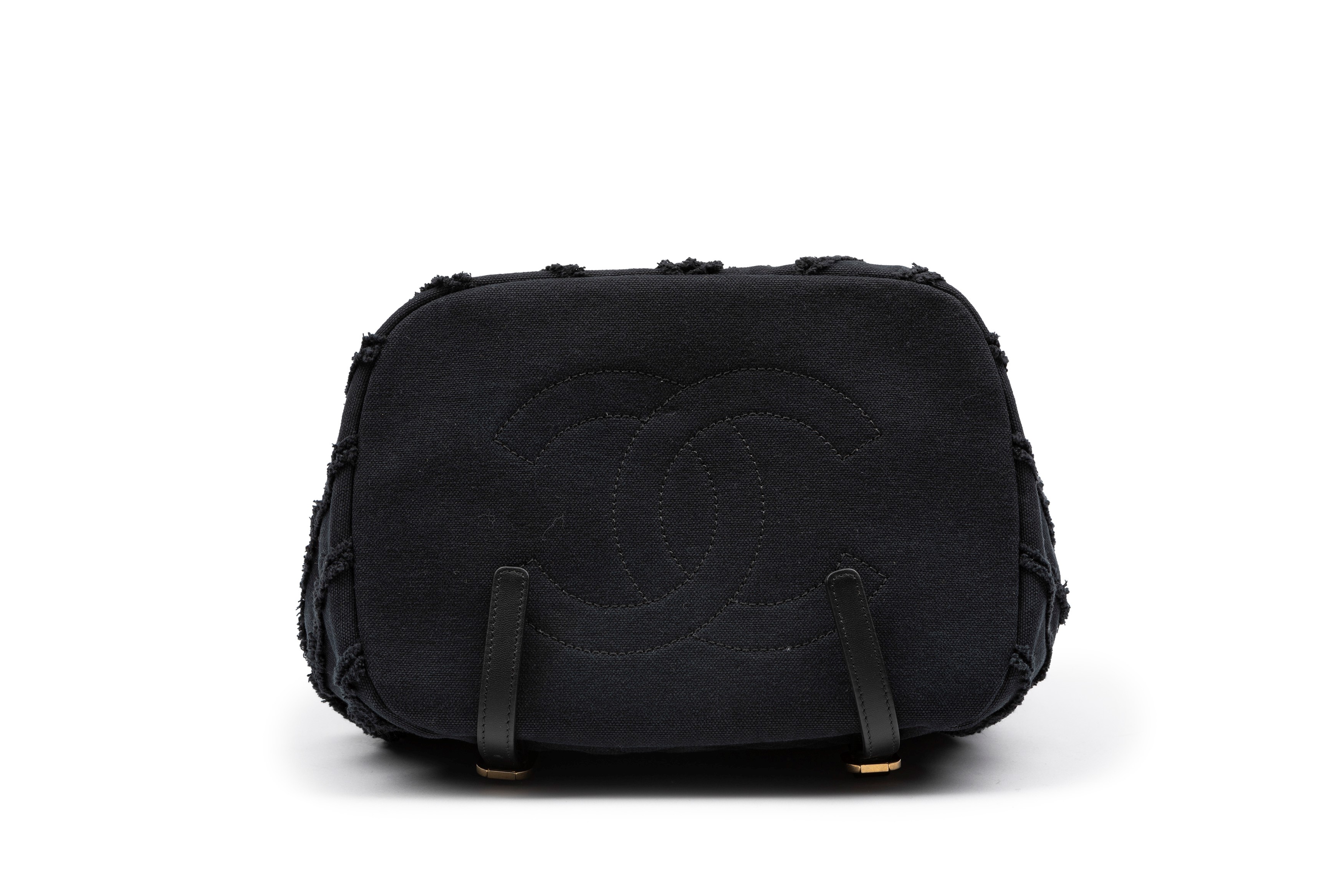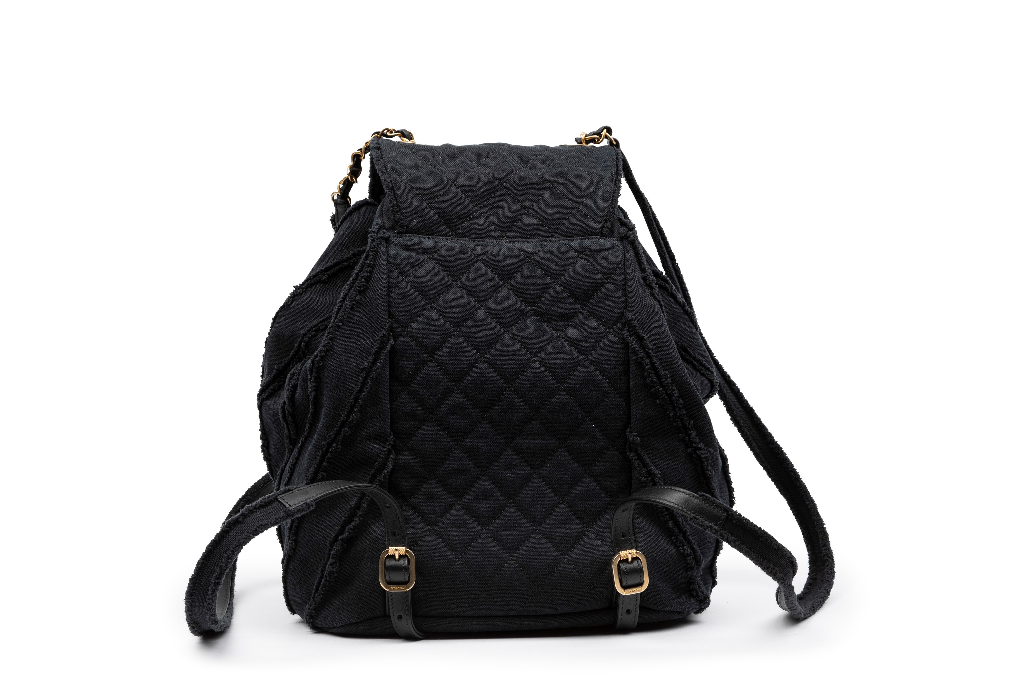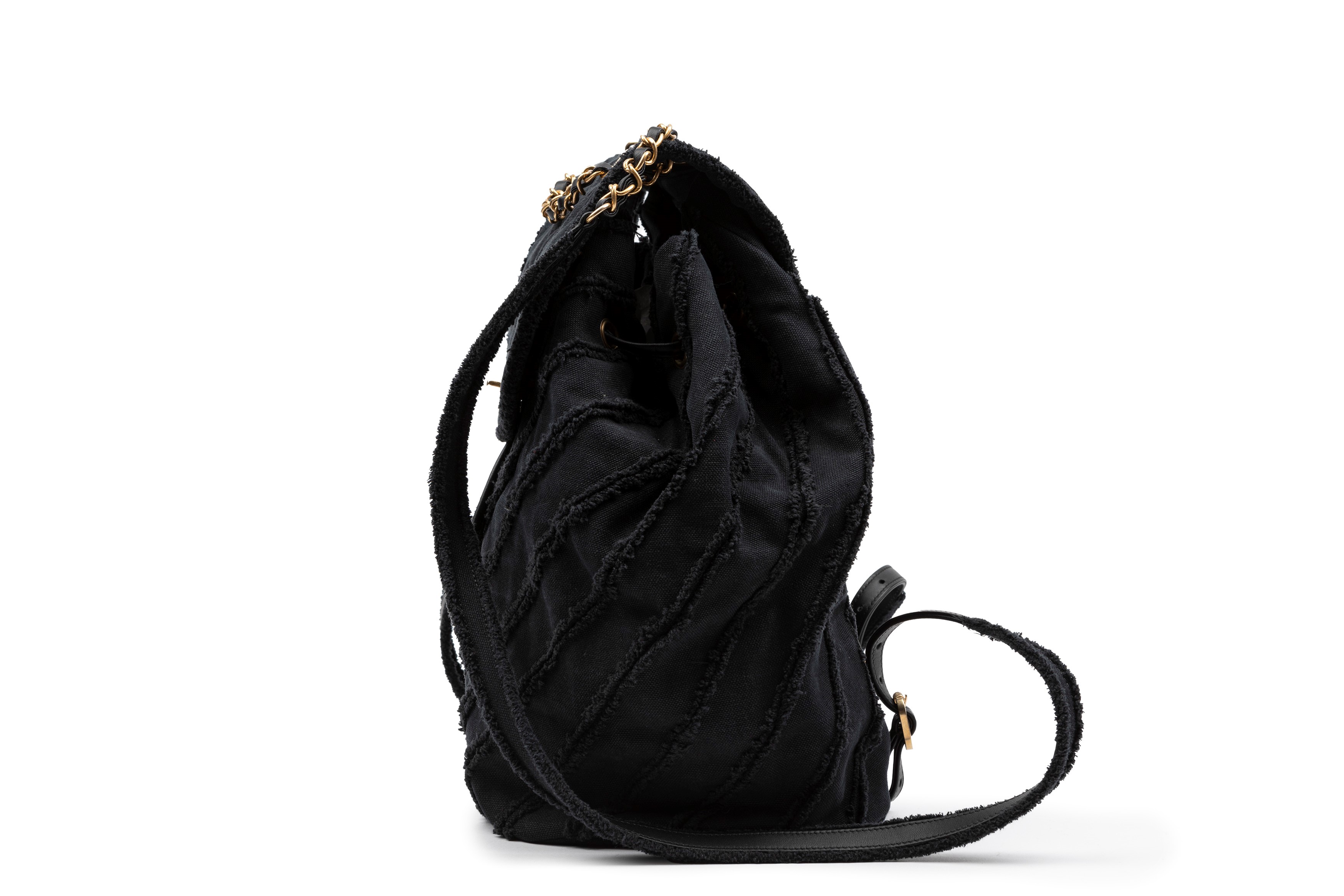 Black canvas backpack, metal gilt and leather details, double shoulder adjustable straps, base cm 25, with dustbag