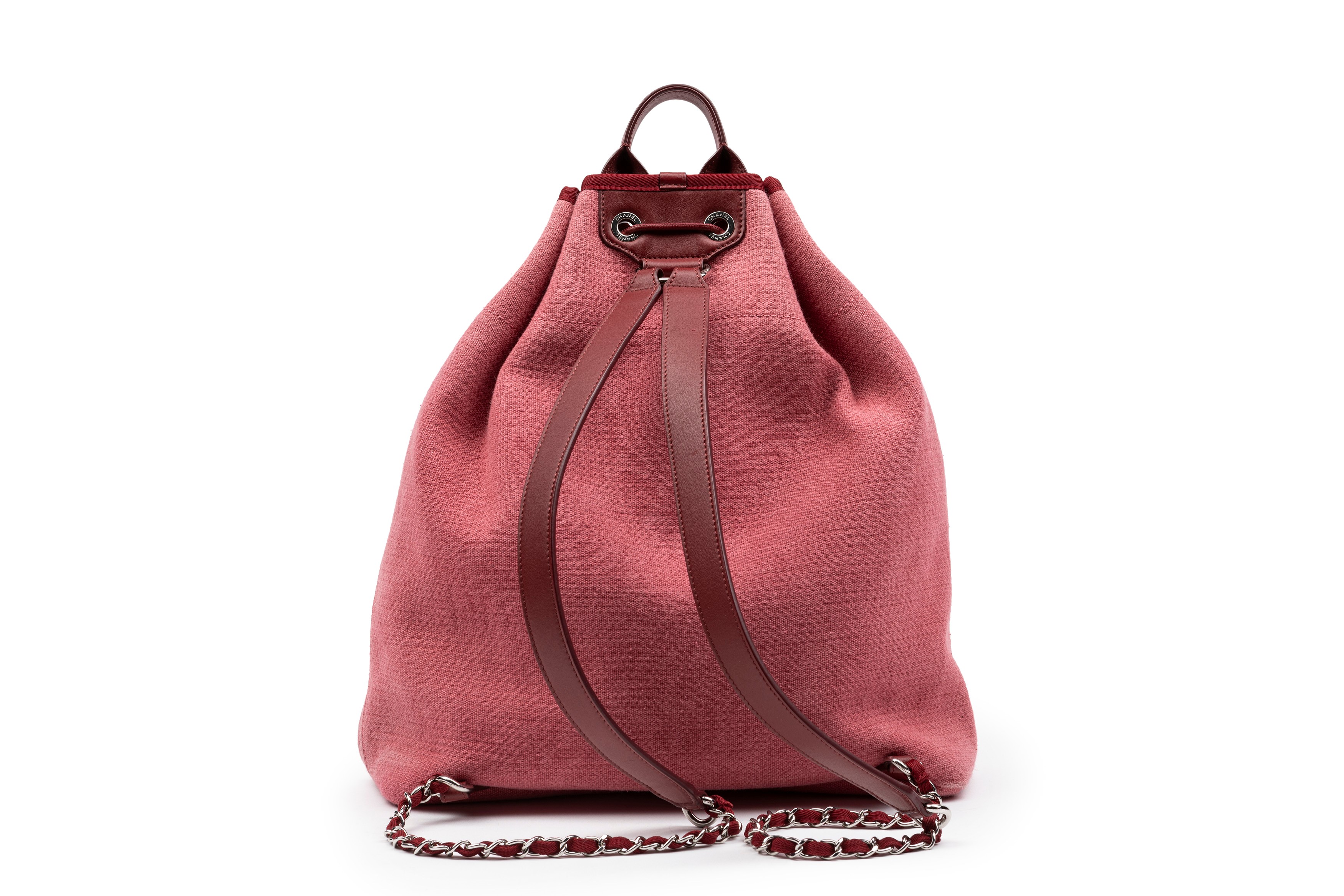 Dark pink canvas Deauville Rue Cambon large backpack, double burgundy leather shoulder strap, metal details, cm 34, with dustbag (slight defects)Starting bid