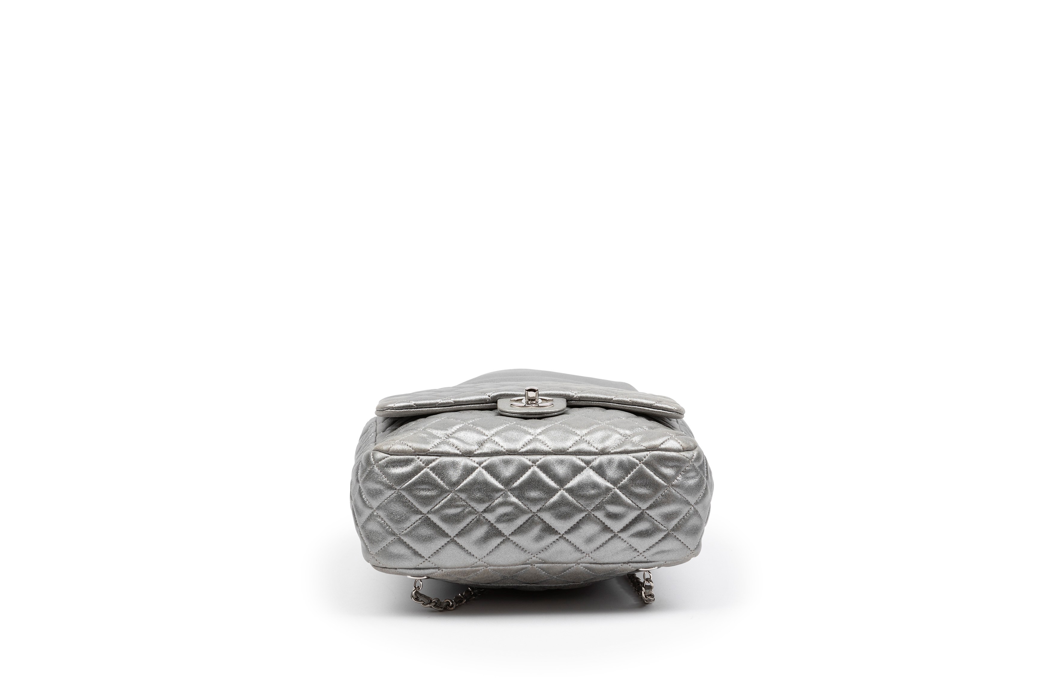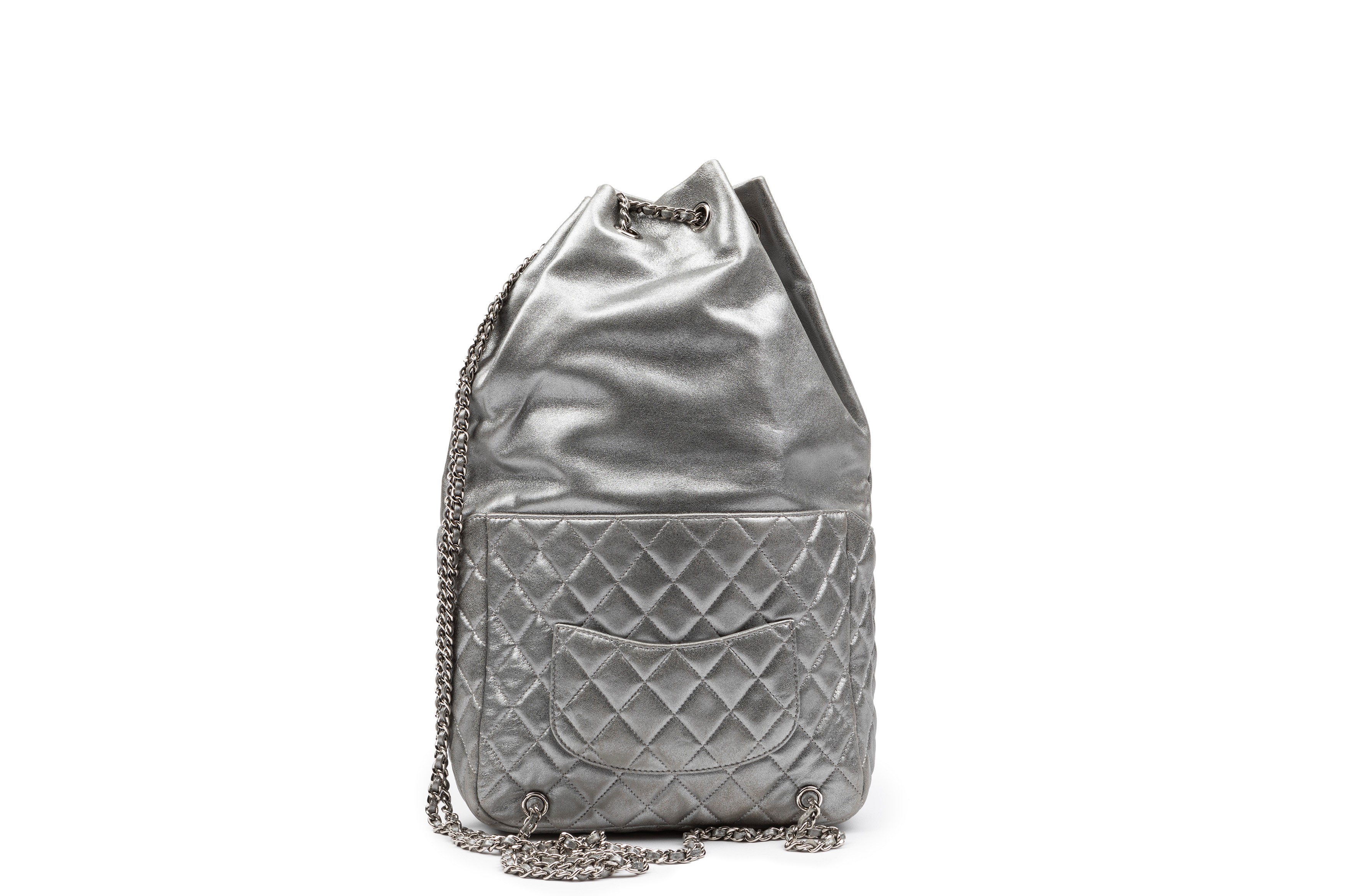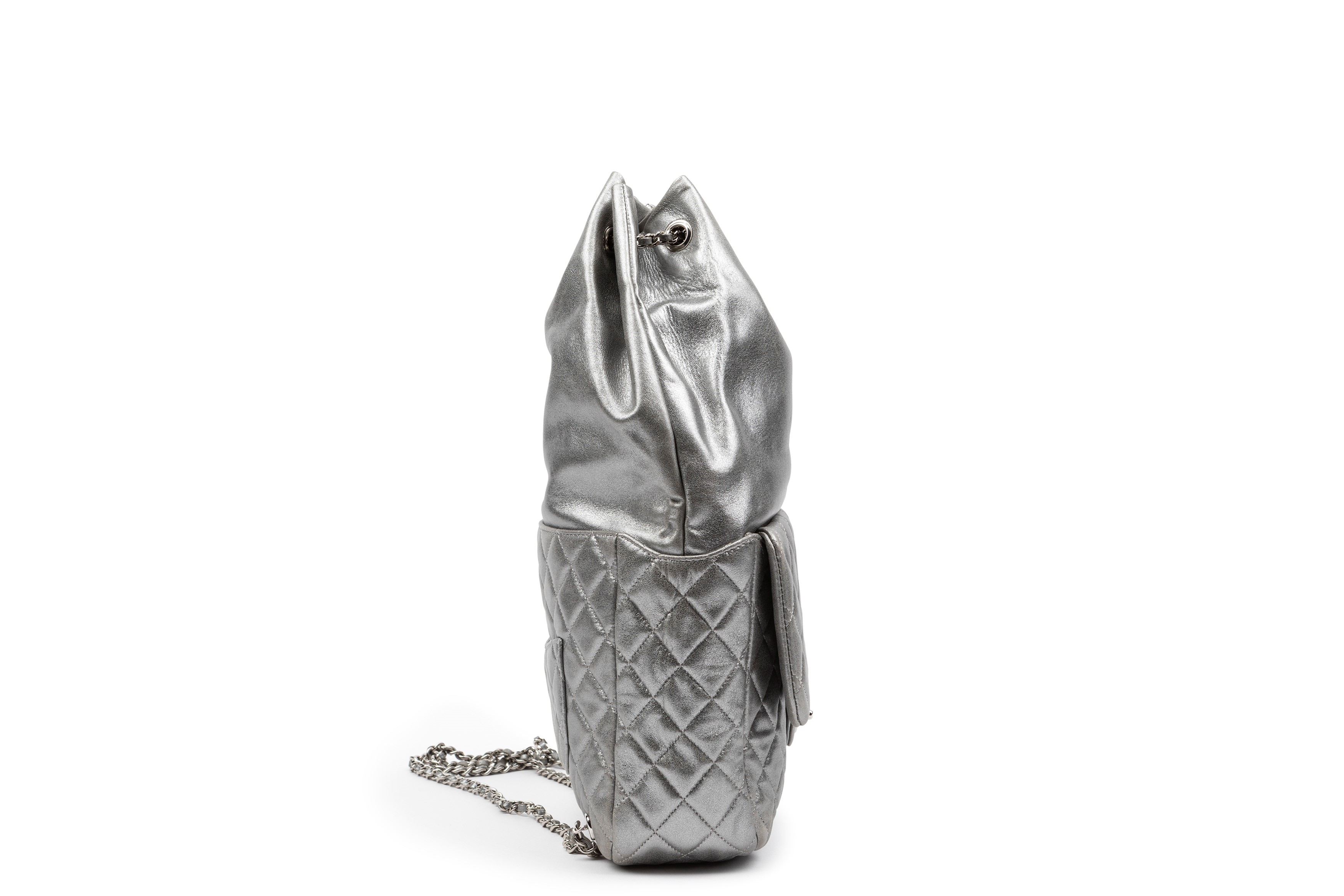 Silver matelassé leather backpack, double shoulder metal chain, base cm 20, with dustbagStarting bid
