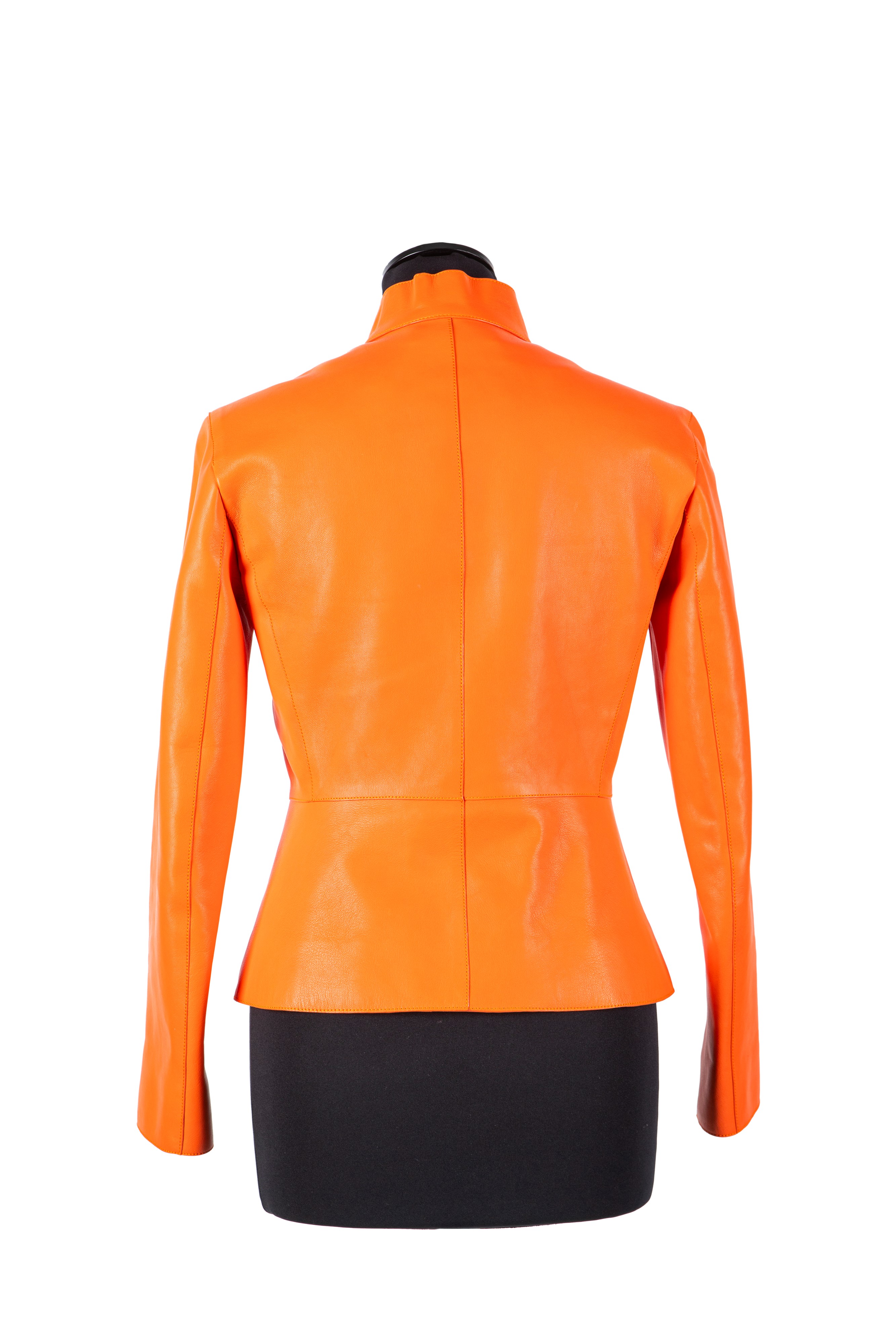 Orange mandarine chèvre grainée leather biker jacket, zip closure, silk lining, size 34 french, with dustbag (new and never worn)