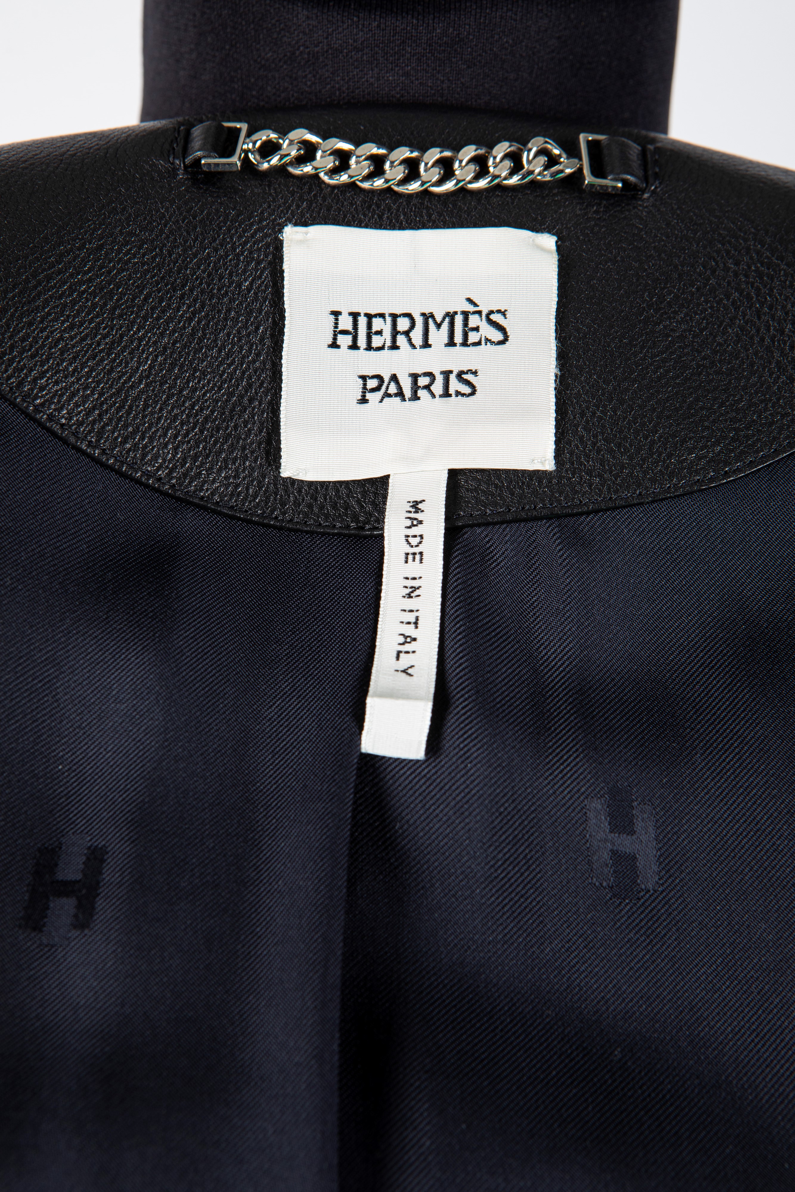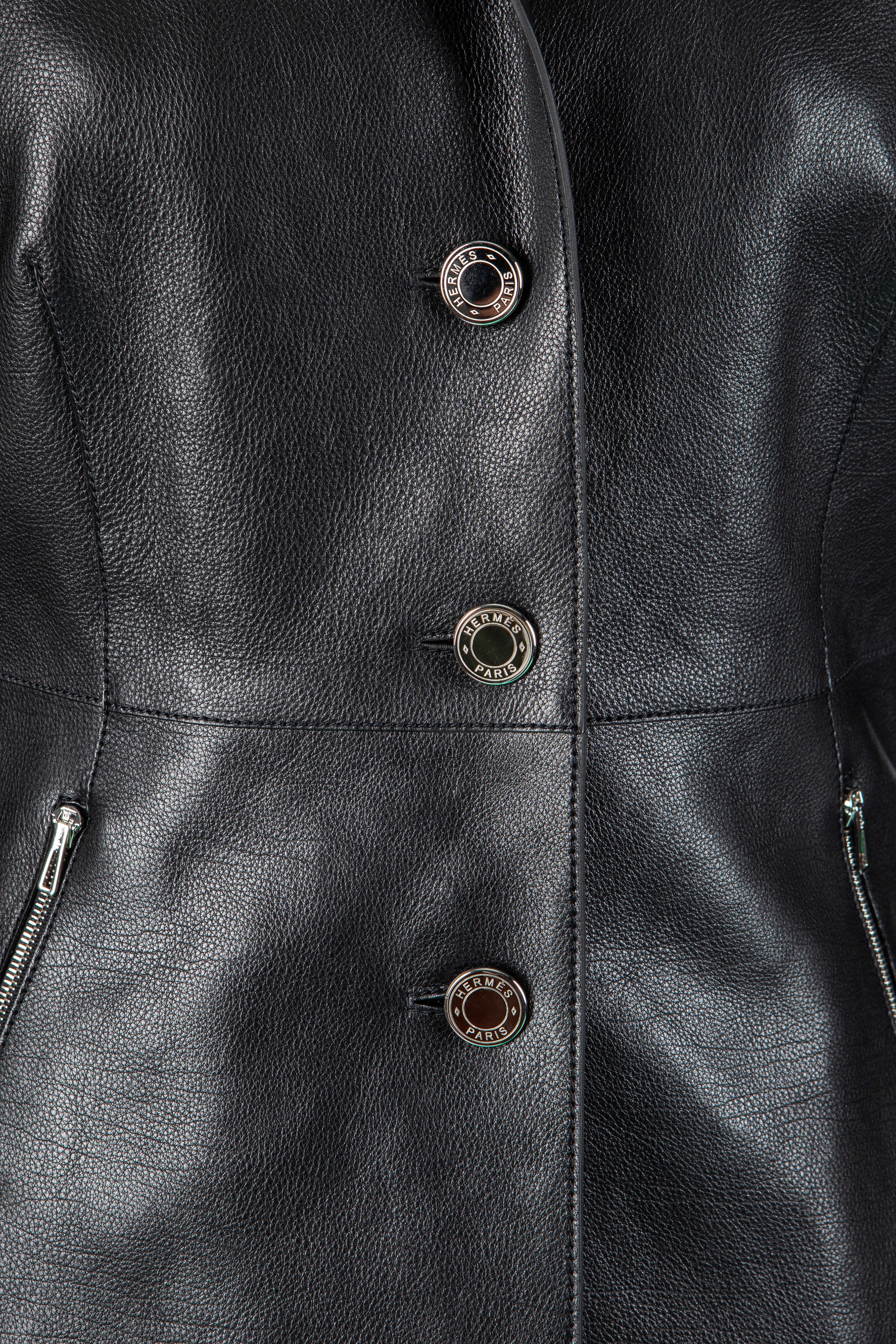 Black leather long sleeves jacket, clou de selle metal buttons, double pockets with zip closure, silk lining, french size 34, with dustbag