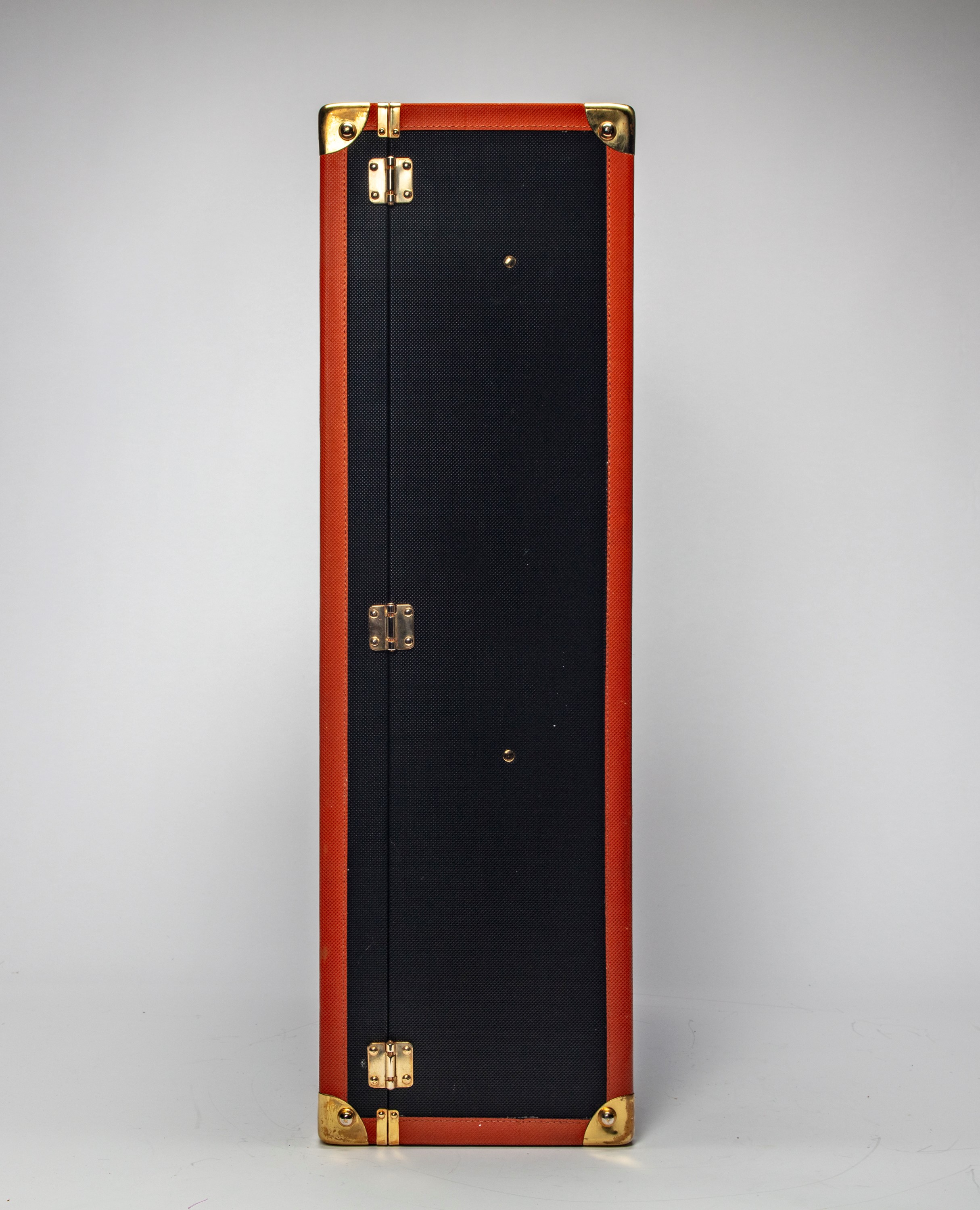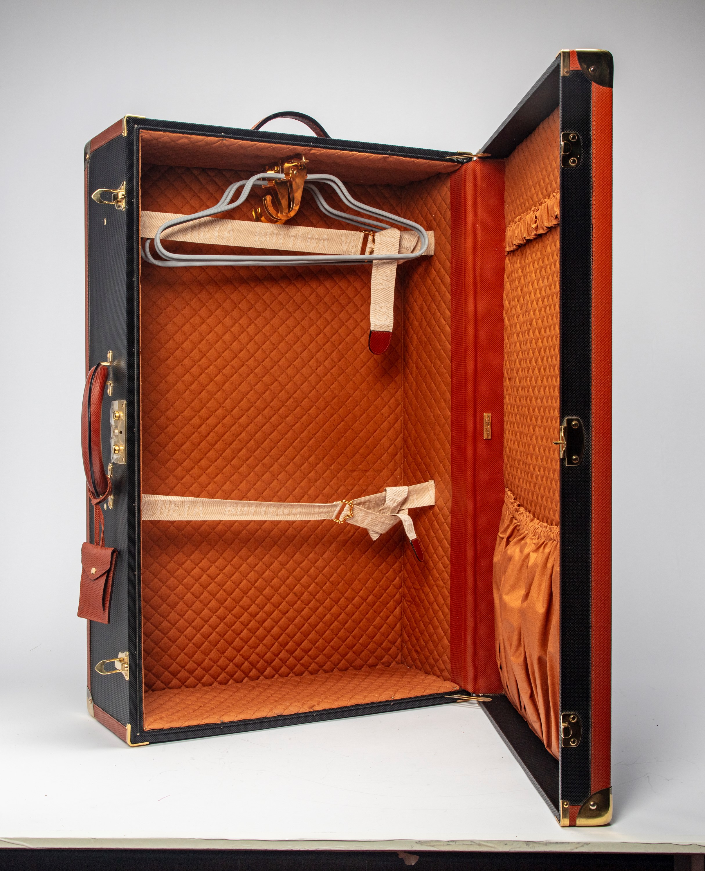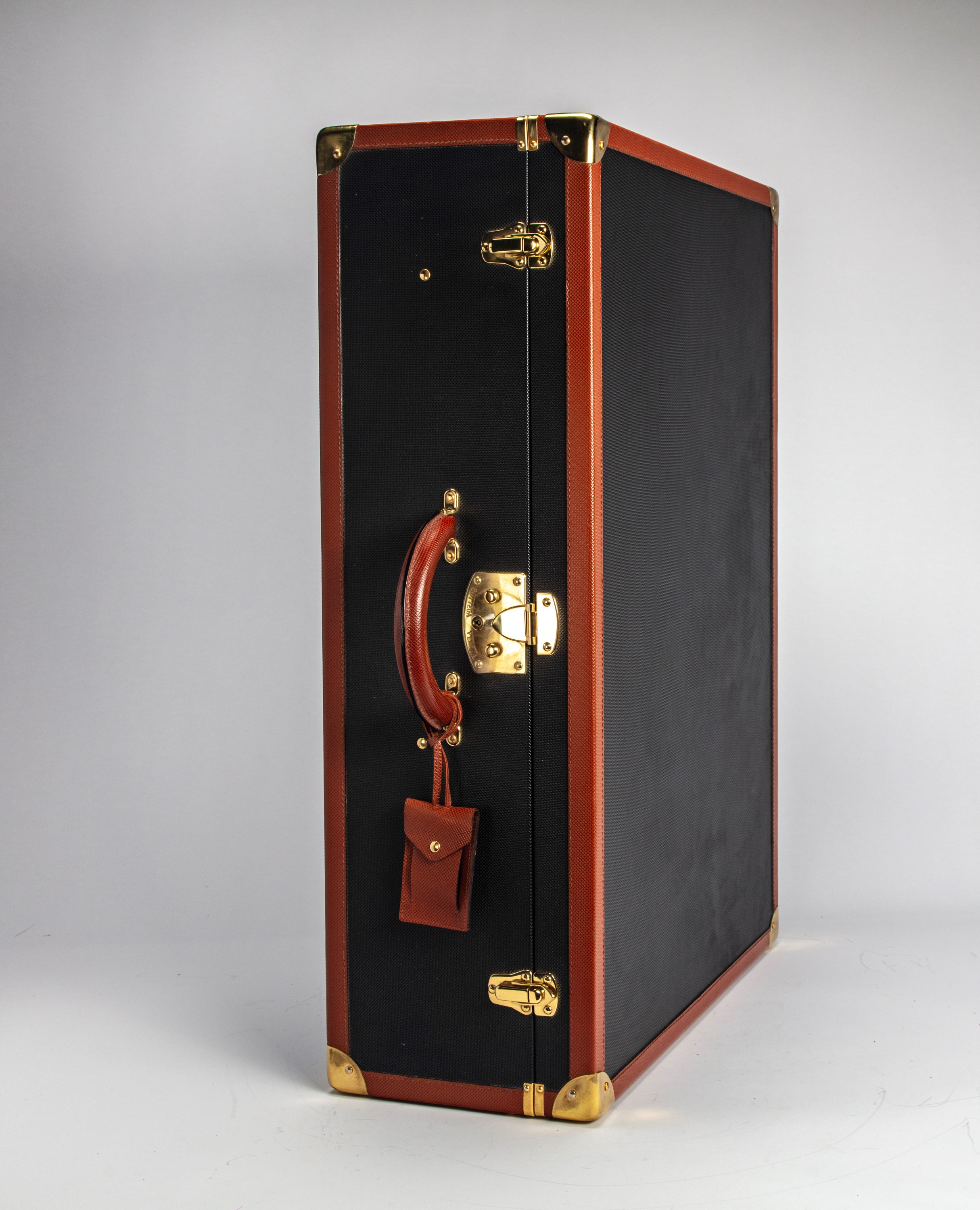 Black leather and fabric rigid suitcase, metal gilt details, fabric lining, with four hangers, cm 79 x 24 x 52 (slight defects)
