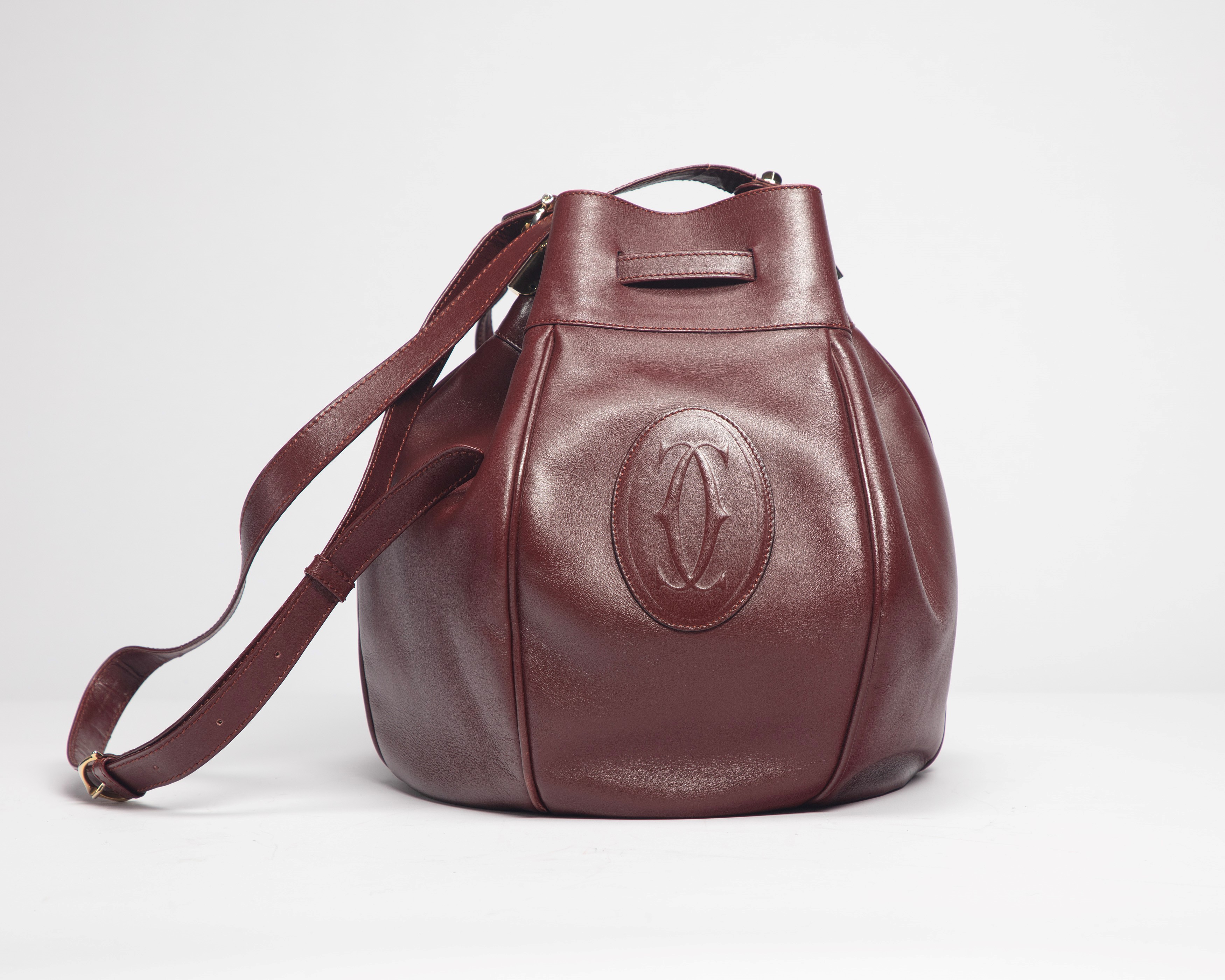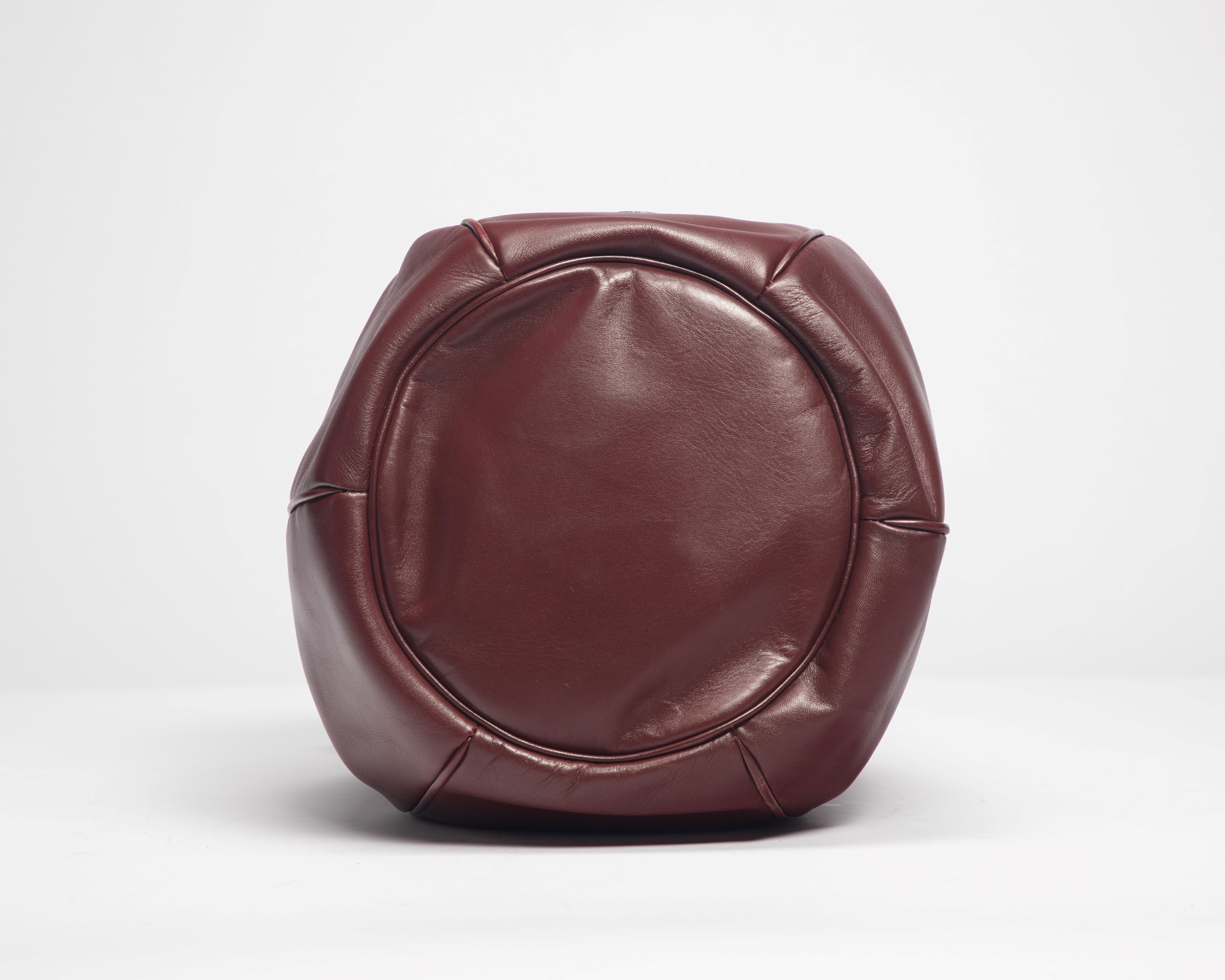 Burgundy leather bucket bag, with adjustable shoulder strap, metal gilt details, dm cm 23, with box (slight defects)