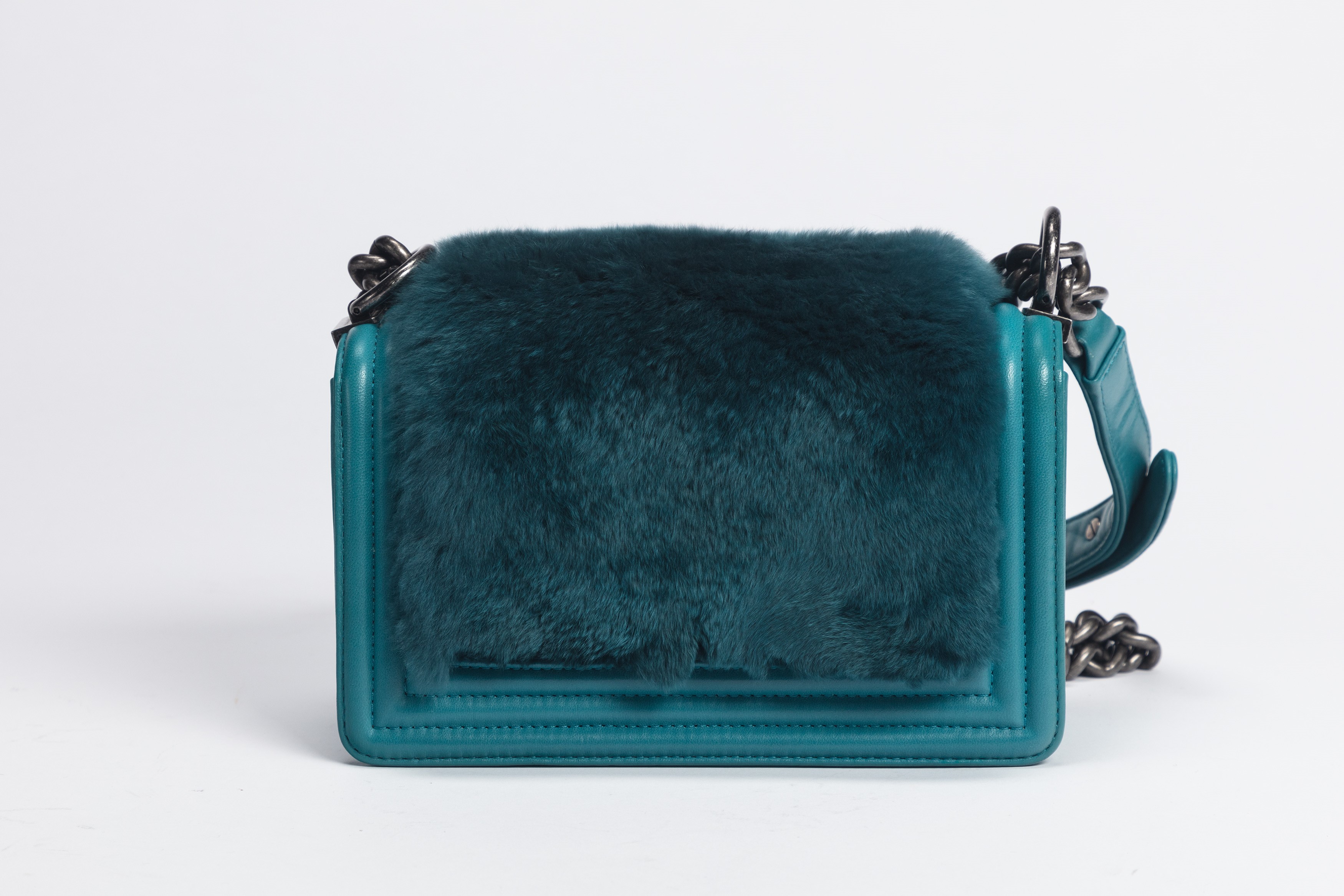 Ottanium blue leather Boy bag, burnished metal chain strap, cm 20, with dustbag