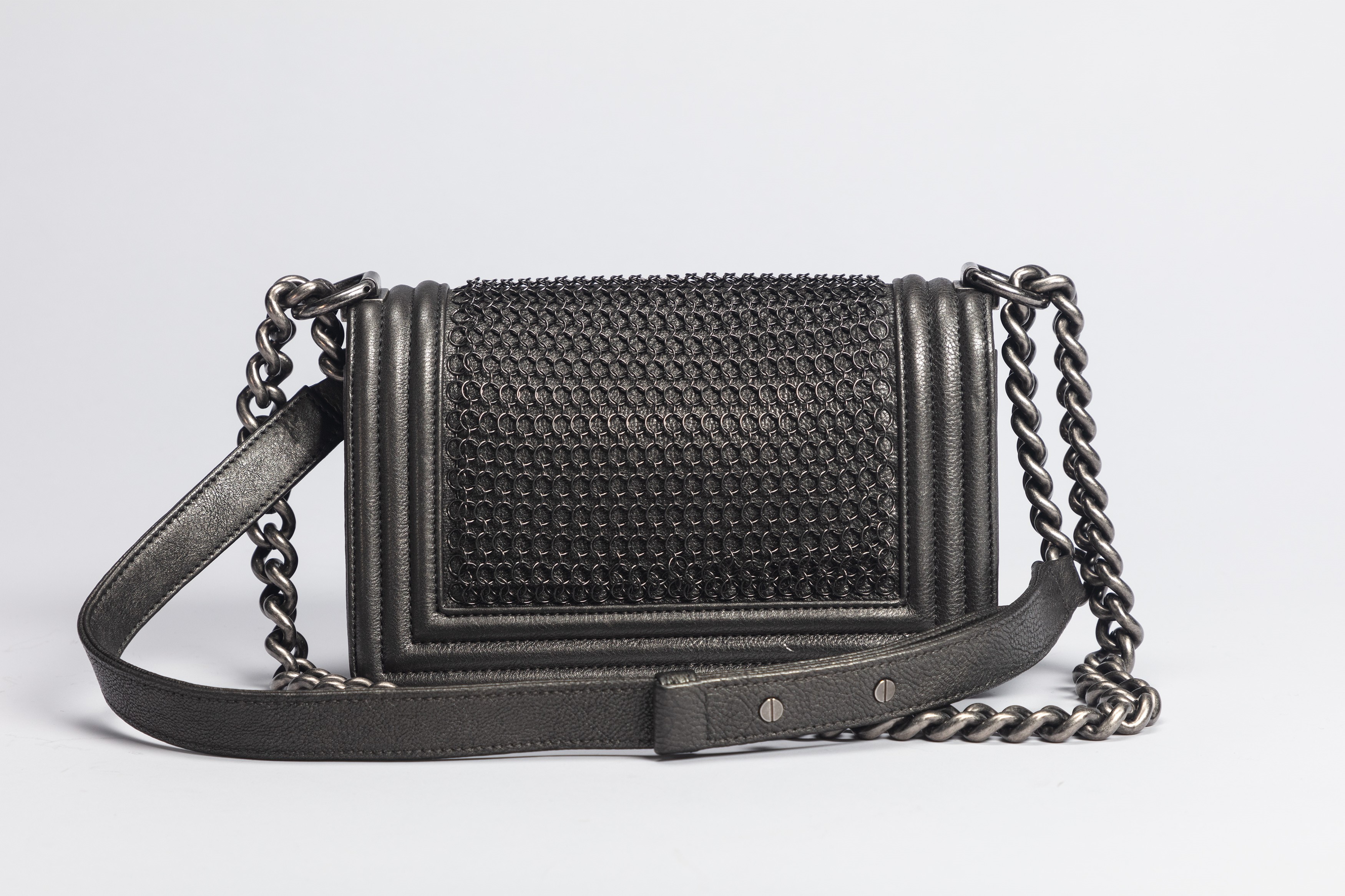 Bronze colour leather Boy bag, metal mesh insert, burnished metal chain strap, cm 20, with dustbagStarting bid