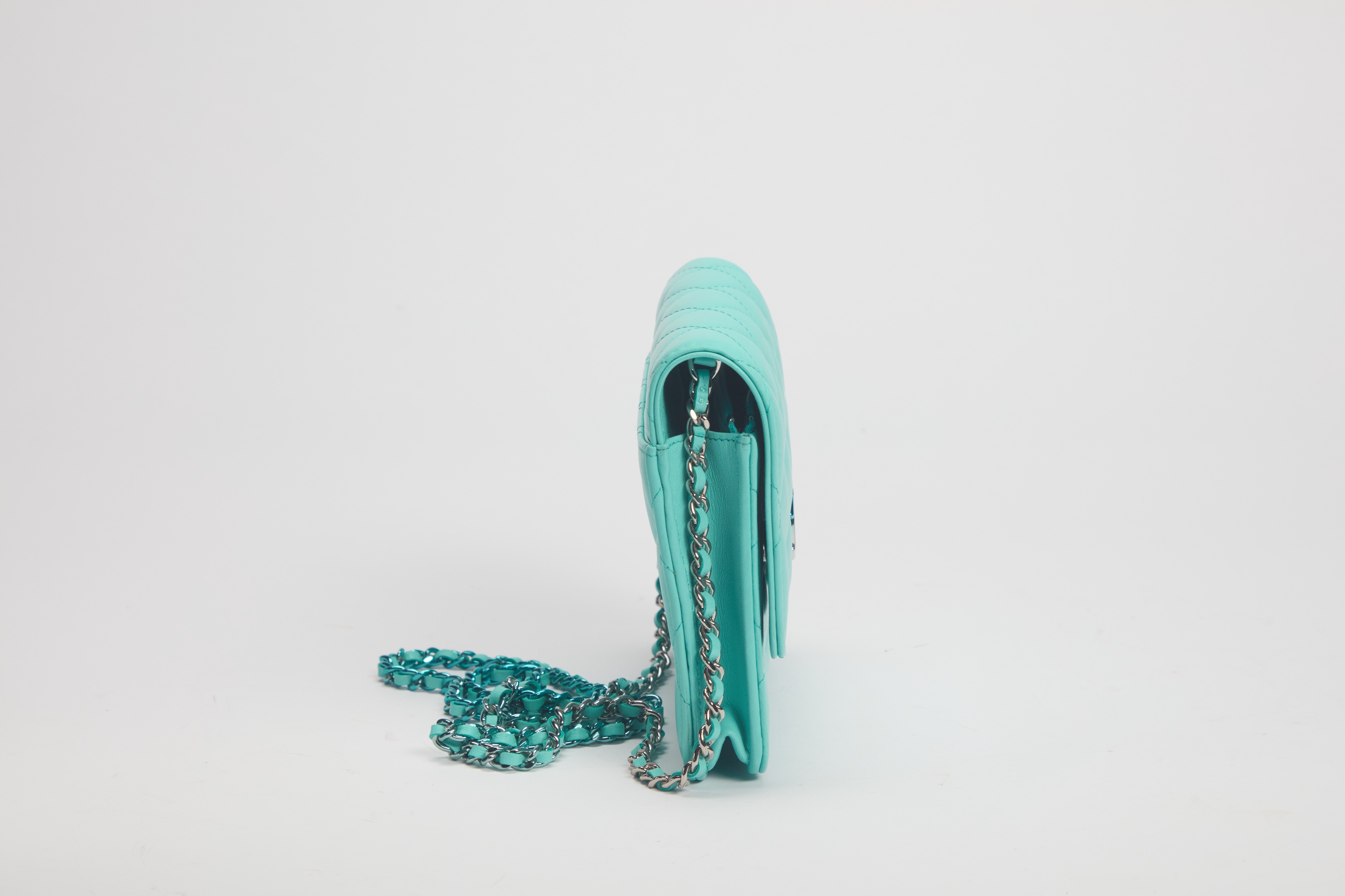 Turquoise matelassé leather shoulder strap Wallet on chain bag, metal details, cm 19, with dustbagStarting bid