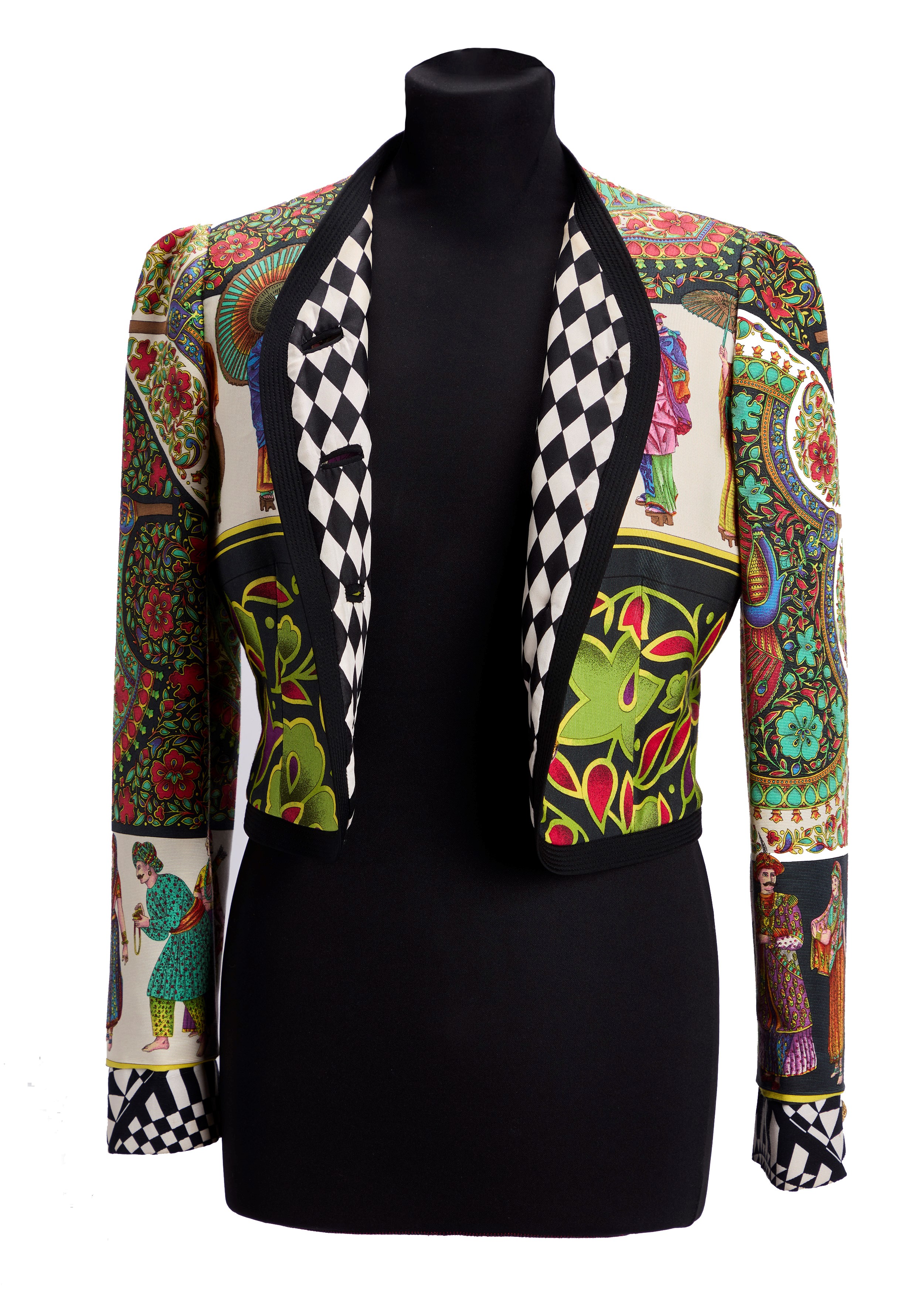 Multicolor silk and cotton long sleeves jacket, printed Japanese figures and flowers, metal gilt and purple glossy paste buttons, black and white lining, size not indicated on the label (very slight defects)