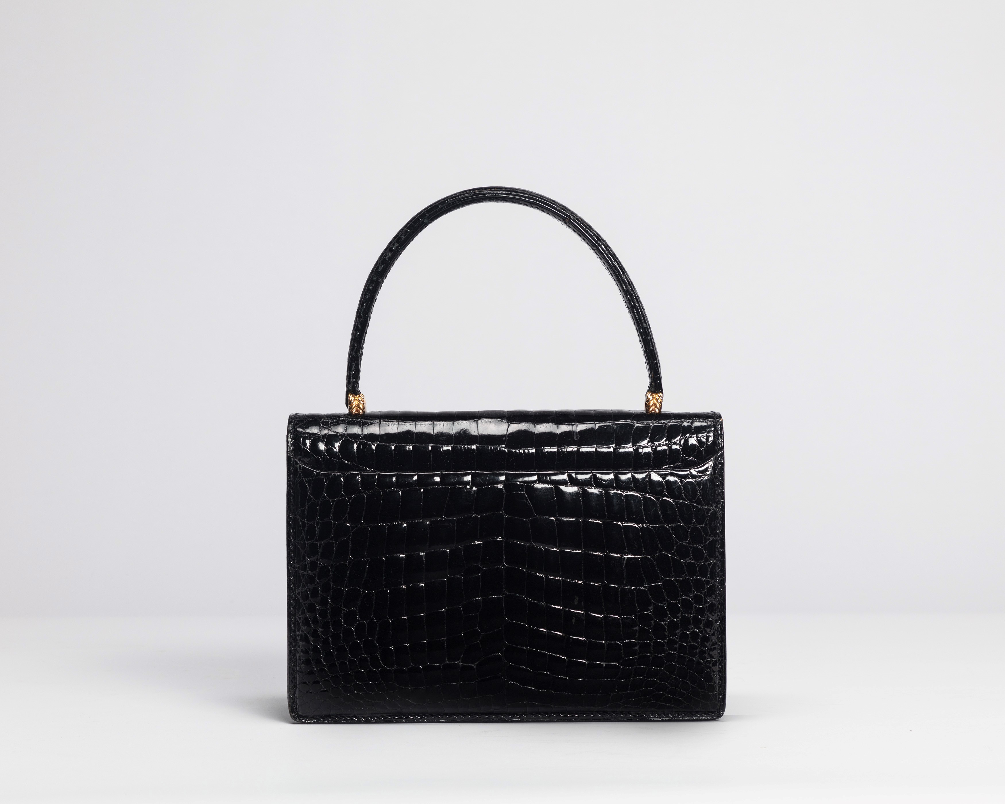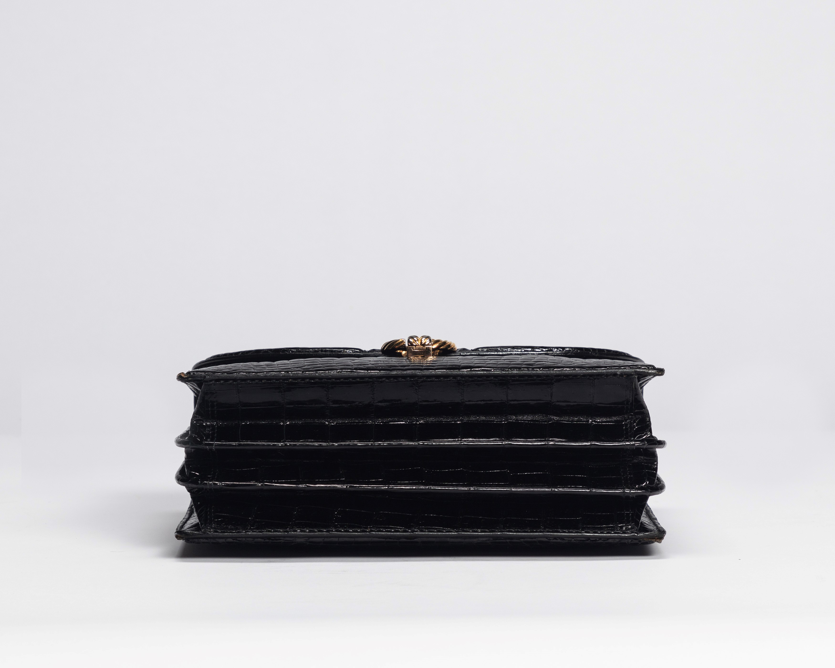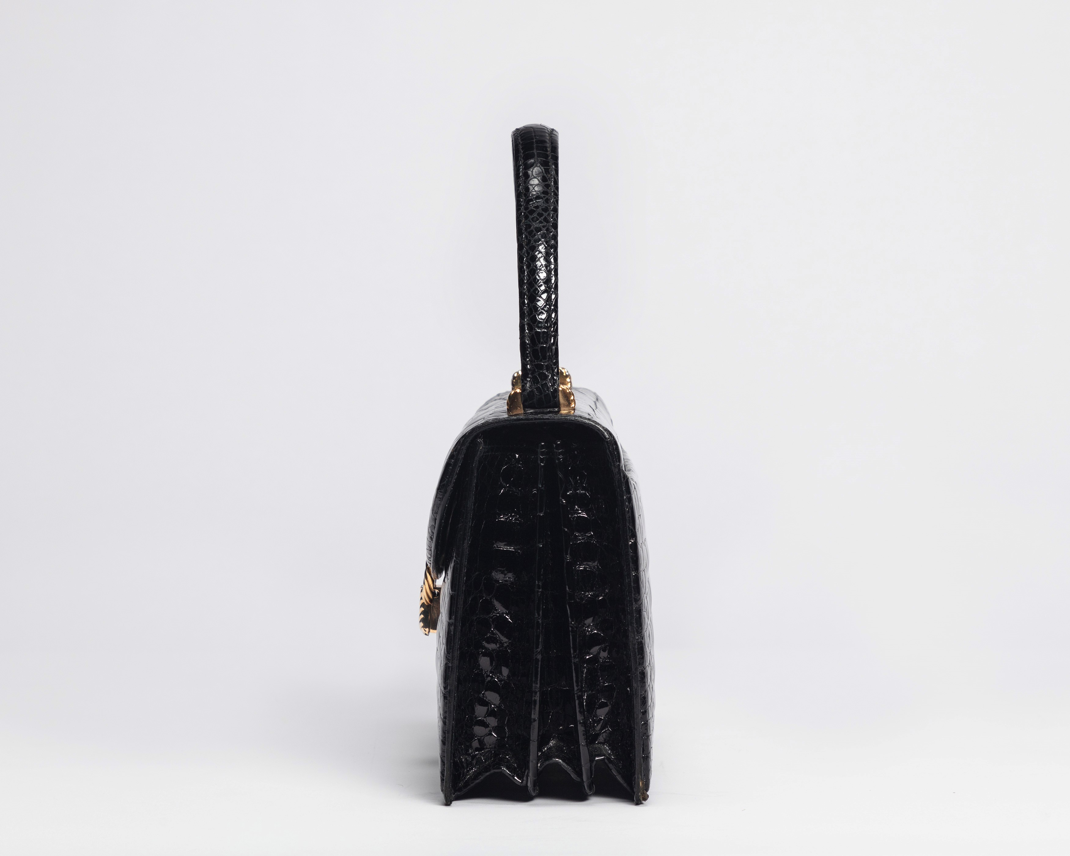 Cm 22Black crocodile leather bag, metal gold details, leather lining, late 1960s, cm 22, with dustbag (slight defects), (pre Cites convention)